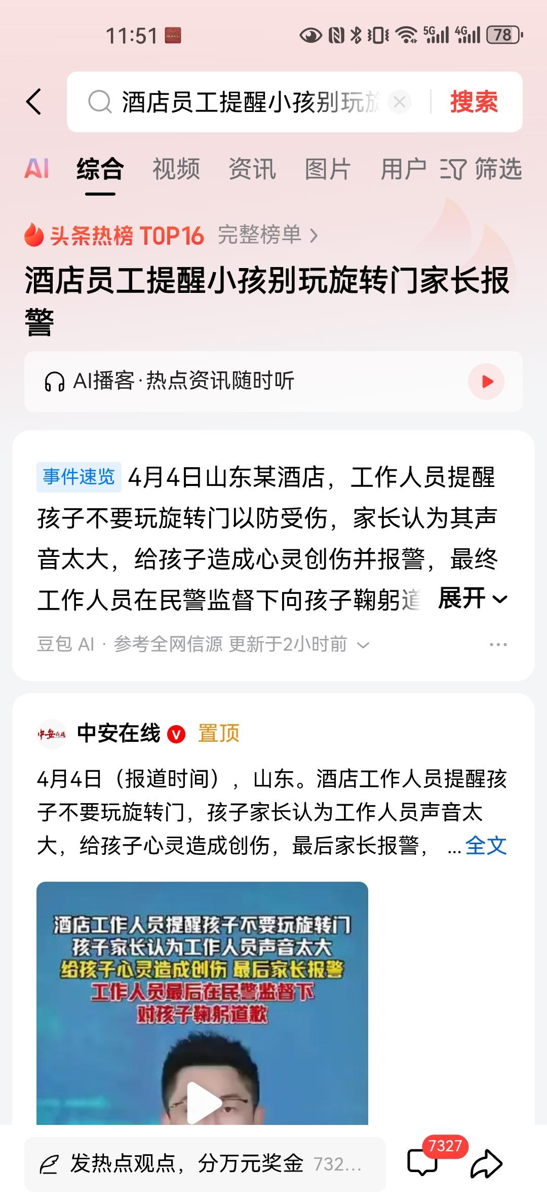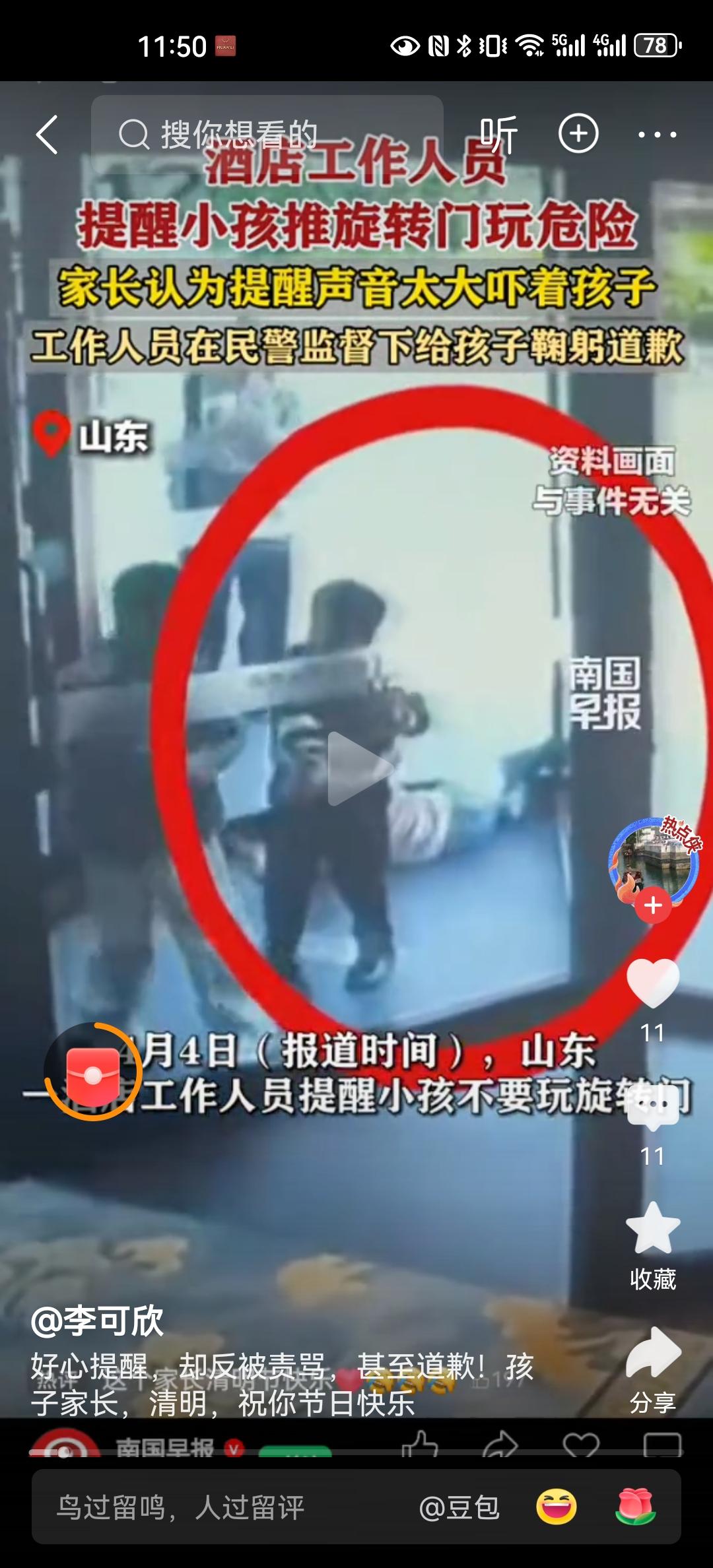 这是发生在山东某酒店,有三个小孩推着旋转门在玩耍,旋转门飞快在旋转,其中还有一个小孩明显摔倒了。酒店工作人员在里面提醒“不能这么样玩儿,小孩快出来”,于是招来了一位父亲的责备,认为工作人员态度不温和,声音太大给孩子心灵造成创伤。 这样的处理方式,会不会将来惯出一个熊孩子?调解的结果是让家长解气了,但会不会造成酒店工作人员的心理创伤?这件事真的应该让工作人员鞠躬道歉吗?德先生觉得可能会引发很大的争议,大家看看视频,觉得如何评判呢?