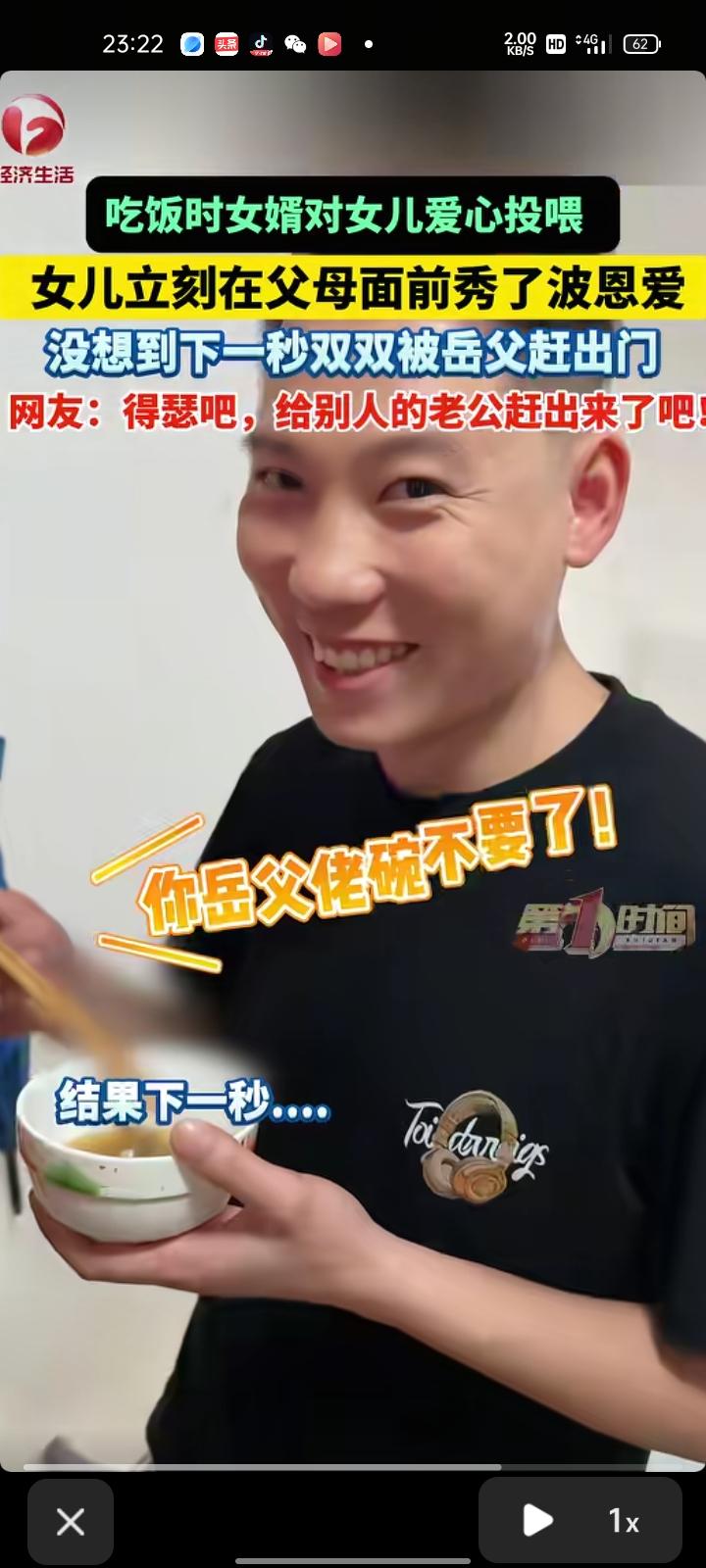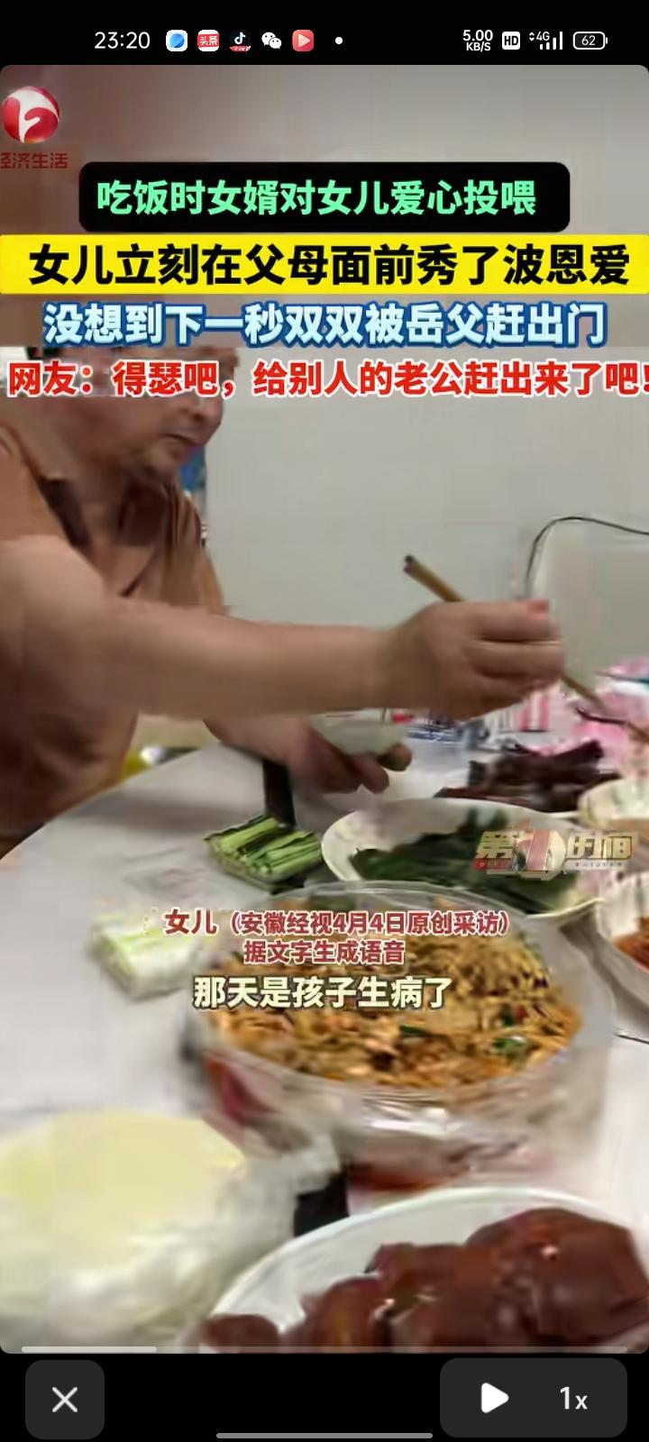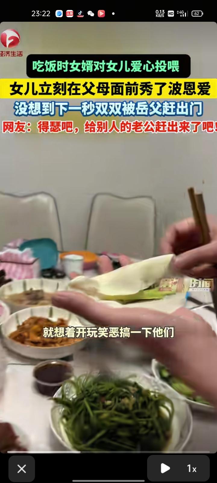 3月30日,广西柳州。吃饭时女婿对女儿爱心投喂,女儿立刻在父母面前秀了波恩爱,结果下一秒双双被岳父赶出门。 当事人称,平时都是父母带小孩,那天是孩子生病了,她和老公回去接孩子,就想着开玩笑恶搞下他们.
