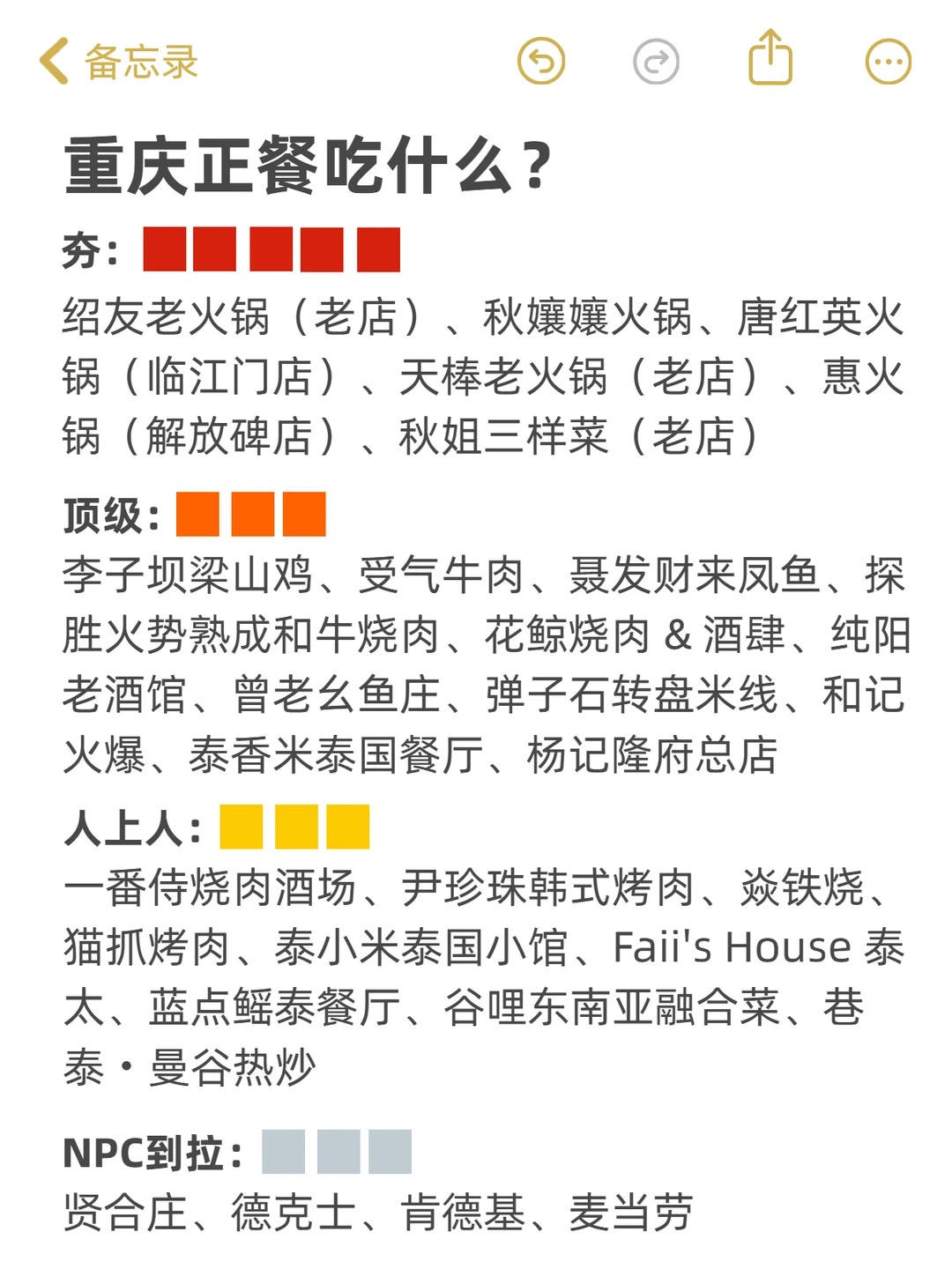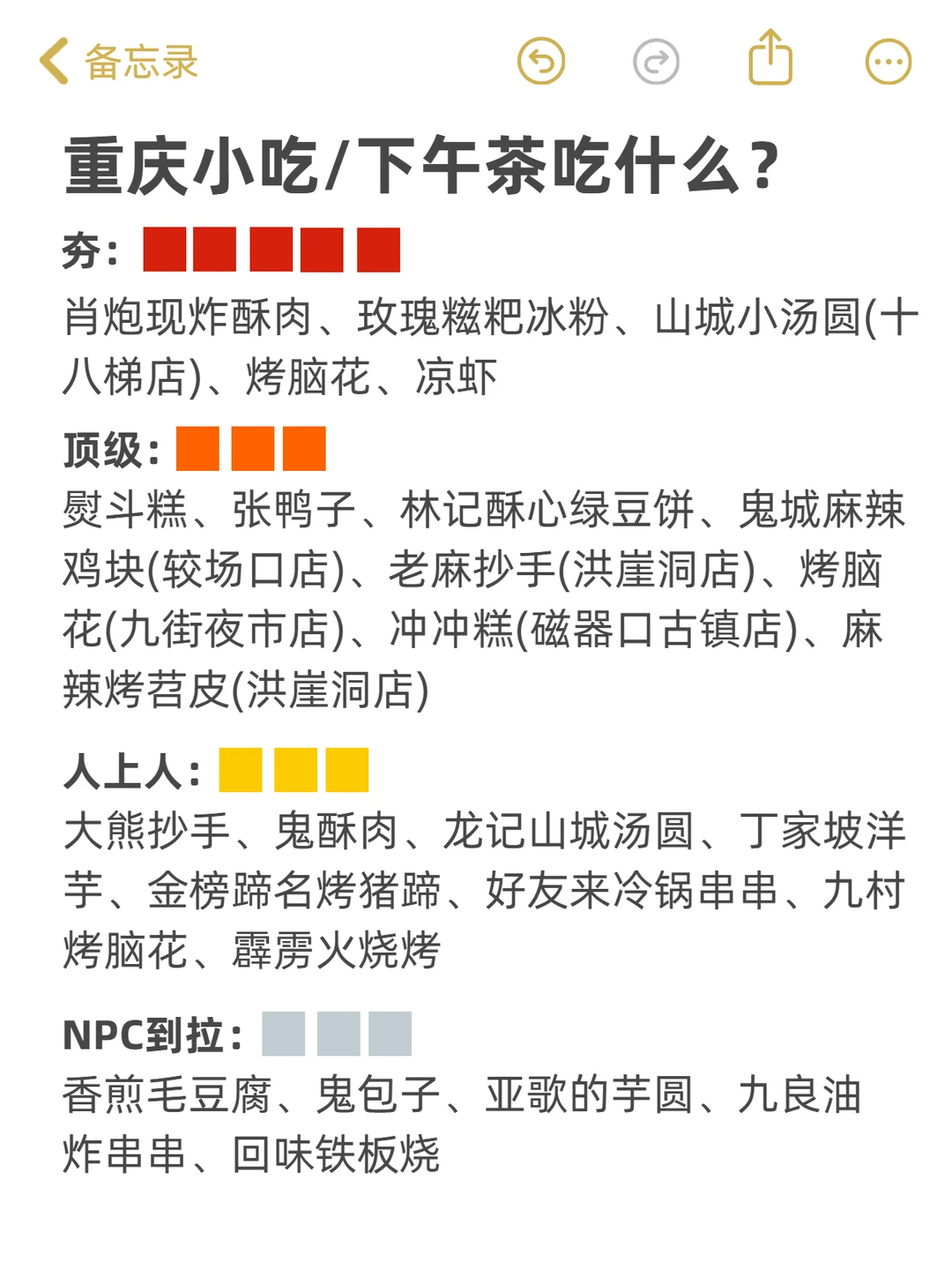 最近总刷到网上这个评级的梗,真的太有意思了! 必须给姐妹们安排上重庆的专属榜单啊! 早餐、正餐、小吃、下午茶…都有 整理完只想说…重庆真的吃!不!完! 在山城呆了这么多年,居然还有这么多没打卡过的😭 NPC以上的可以去试试,NPC及以下的就偶尔解馋可以,别期待太高... - 更多重庆旅游攻略可以看这里