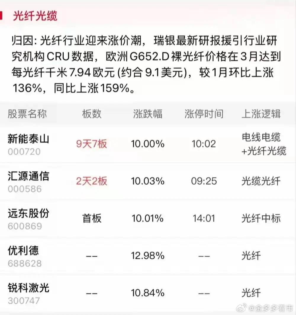 汇源的一字板确实挺令人意外的,毕竟中利、泰山在光纤首板中辨识度要高很多,但是汇源的优势在于低位首板,而且流通市值偏小,确实是板块强势的情况下比较适合走加速的个股,所以周五它的一字板是对板块带动巨大的,也是周五整个光纤强势的基准点!