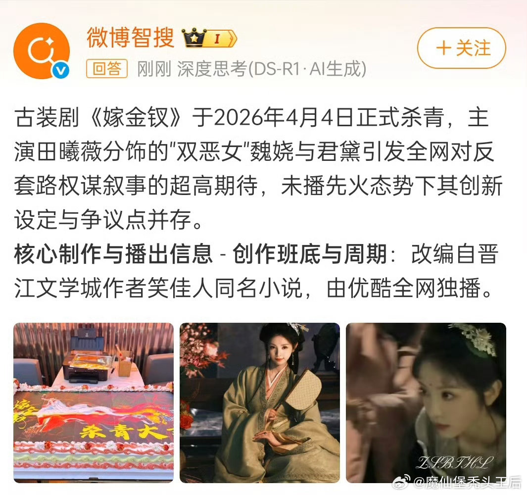 田曦薇嫁金钗杀青田曦薇的嫁金钗今天杀青啦!因为最近播剧的舆论环境不行,对接说选择