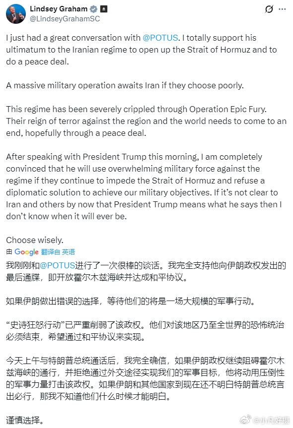 收钱办事的战犯犯!臭名昭著的美国政棍格雷厄姆今晚叫唤:“与特朗普通话,我完全支持他向伊朗政权发出的最后通牒.........”在近2000条来自全球网民的留言中,绝大部分是骂它。美伊以冲突伊朗驻华大使馆发布战果伊朗称击中美军黑鹰直升机黄媒不会说的真相