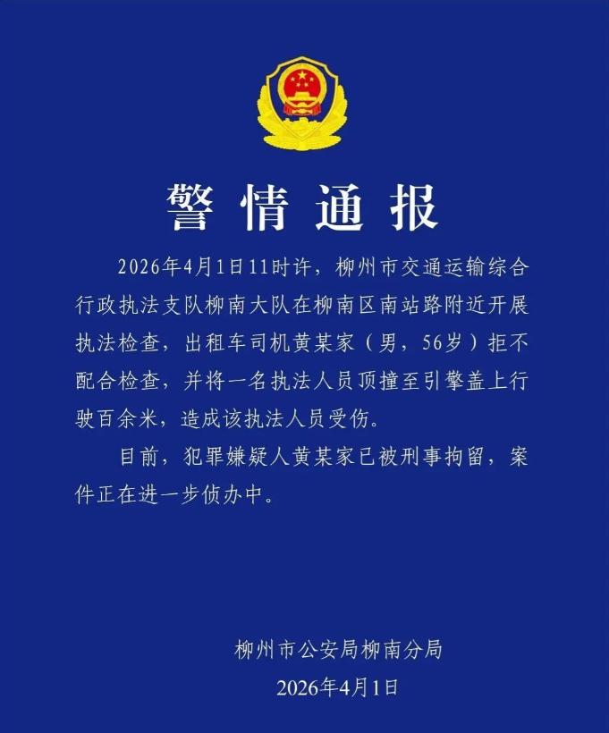 “牢底坐穿!”广西柳州,56岁男子驾驶一辆出租车,在执法人员例行检查的过程中,不仅拒绝配合检查,还一脚油门撞向执法人员至引擎盖上,行驶百余米才停车,造成该执法人员受伤。目前,男子已被刑事拘留,案件进一步调查中。网友:这是故意杀人! 事情发生在4月1日早晨七点多,天刚亮没多久,柳州南站路那边,柳州市交通运输大队的执法人员正在正常例行检查,都是按规矩办事,排查问题车辆,保障大家出行安全没什么特别的。 就在这时他们拦下了一辆出租车,开车的是黄师傅今年56岁了,开了大半辈子出租车,按说也是个懂规矩、知分寸的老司机,怎么也想不到,他会做出后来那样极端的事。 按照检查流程,黄师傅只需要把相关证件递过去,配合执法人员核对一下,没什么问题就能正常走,可他却不配合,当场就把脸拉得老长,一脸不耐烦嘴里还骂骂咧咧的,不管执法人员怎么说,就是不肯交出证件。 执法人员也没跟他硬来,一直好言相劝,耐心跟他解释,说这只是例行检查,很快就能结束,让他配合一下,可黄师傅根本听不进去,脾气越来越冲,情绪也彻底失控了。 就在执法人员还在劝说的时候,意外突然发生了,黄师傅猛地踩下了油门,车子瞬间冲了出去,而当时,有一位执法人员就站在他的车前,根本来不及反应,就被车子直直撞了上去。 那一下撞得不轻,执法人员直接被顶翻,整个人都挂在了出租车的挡风玻璃上。可黄师傅并没有停车,反而继续加速,就那样,引擎盖上挂着一个人,他开着车在马路上左摇右晃,一路拖行了整整一百多米。 这一百多米看着不长,可对被挂在引擎盖上的执法人员来说,每一米都是煎熬,浑身是伤,随时都有生命危险,而对黄师傅自己来说,这一百多米,也彻底把他的后半辈子推向了深渊。 最终黄师傅总算是停了车,被撞的执法人员已经满身是伤,看着十分凄惨,旁边的人赶紧拨打急救电话,将他紧急送医救治,而黄师傅则被执法人员当场控制,随后被刑事拘留,目前这个案子还在进一步调查中,后续还要看法院的审理结果。 大家想想黄师傅今年都56岁了,眼看着再过几年就能退休,在家安安稳稳抱孙子,享享清福,可就因为一时的冲动,做出了这样的傻事,现在只能待在看守所里,等着法律的制裁,这辈子怕是很难再出来了,说句难听的,这跟牢底坐穿也没什么区别。 当时的现场视频,在柳州的司机群里疯传,画面特别残忍,让人看了后背发凉,很多人看完都气得不行,网友们瞬间炸了锅纷纷留言吐槽,有人怒喊:这哪里是抗拒执法,分明就是故意杀人!太嚣张了必须重判,让他付出应有的代价,还有人说执法人员只是在例行公事,为了大家的安全,他凭什么这么嚣张,这种行为就该严惩。 还有法学博主站出来分析,说黄师傅的这种行为,已经触及到了故意杀人的门槛,后续法院审理的时候,关键要看他当时的车速有多快,以及他当时的心理状态是怎样的,如果最终被认定为故意杀人未遂,那可就不是赔钱就能了事的,等待他的,只会是严厉的刑事处罚,最少也要坐很多年牢。 其实说到底,这事儿真的没必要,执法人员查车,不是故意找茬,而是为了路上的安全,避免问题车辆上路,保护每一个出行的人,或许黄师傅当时觉得自己没做错什么,证件也齐全,被拦下检查心里窝火,但再委屈也不能拿别人的生命开玩笑,更不能对抗执法。 法治社会,真觉得自己受了委屈,事后可以去举报、去投诉,申诉的渠道有很多,何必拿命去堵,何必因为一时的冲动,搭进去自己的一辈子,还伤害了别人。 黄师傅现在肯定也后悔了,可世上没有后悔药,牢饭不好吃,这个血淋淋的教训,也给所有司机提了个醒,无论什么时候,都要冷静克制,遵守法律,有话好好说,别一时糊涂,毁了自己,也毁了别人的家庭。