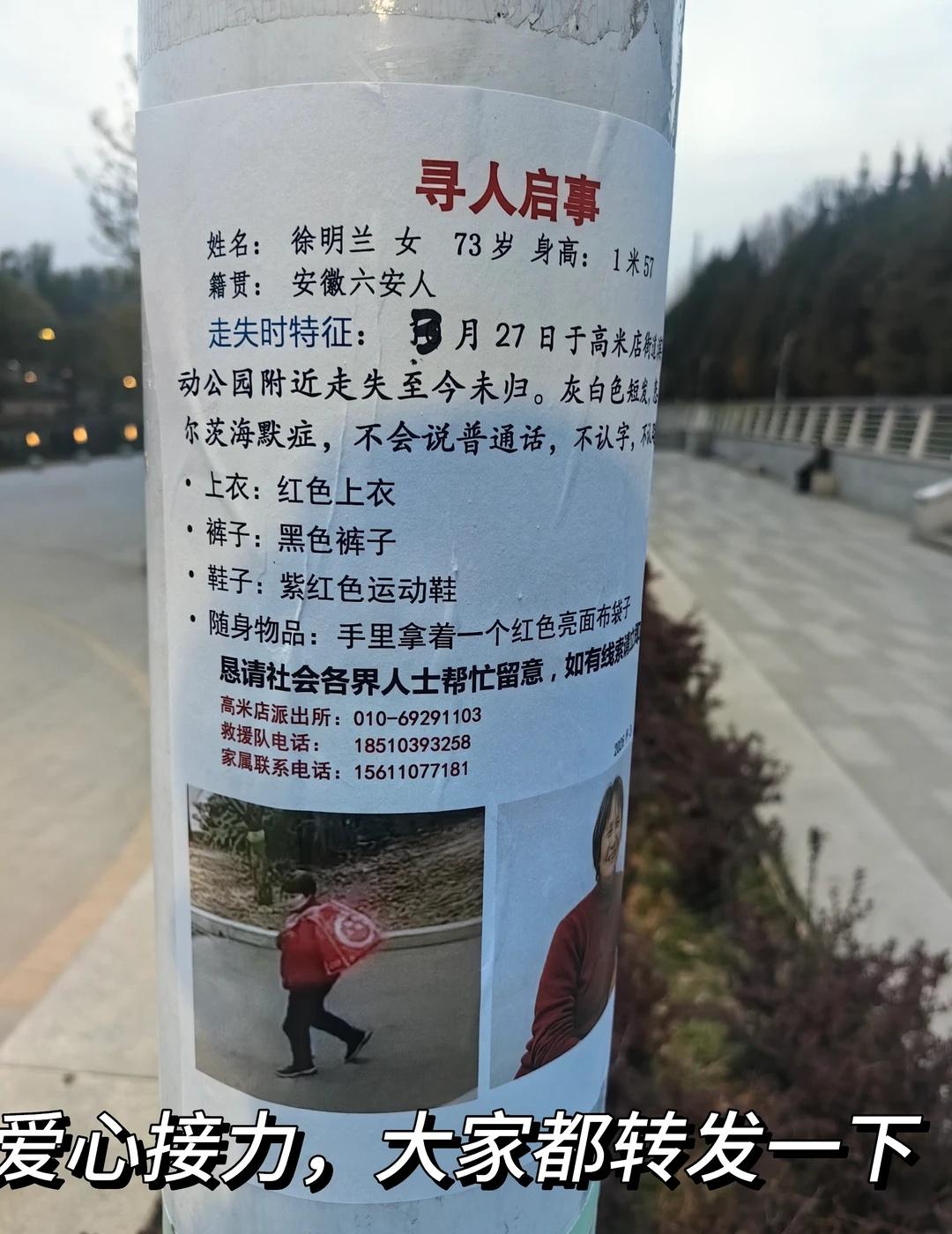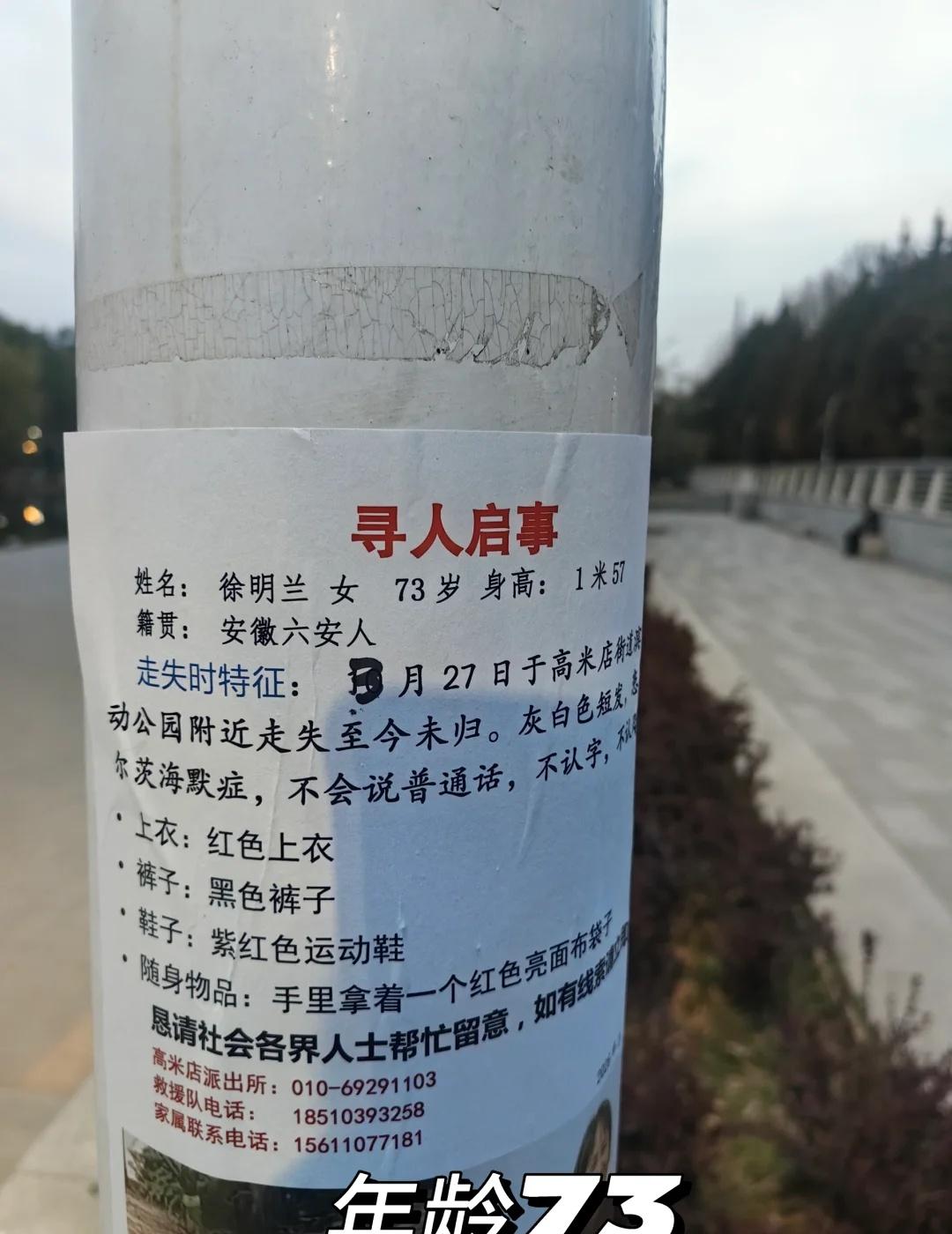 ⚠️刚刚在公园遛弯,看到电杆上贴的寻人启事😭 徐明兰,73岁,身高1米57。3月27日在北京市大兴区高碑店滨河公园附近走失。灰白短发,不会普通话,不认字也不认路。走失时穿红色上衣、黑裤子、布鞋,手里拎着红色亮面布袋子。 奶奶走失好几天了,家人一定急坏了🙏求北京大兴附近的姐妹帮忙留意,有线索请速联系家属或报警!让奶奶早点回家❤️ 北京寻人 大兴走失