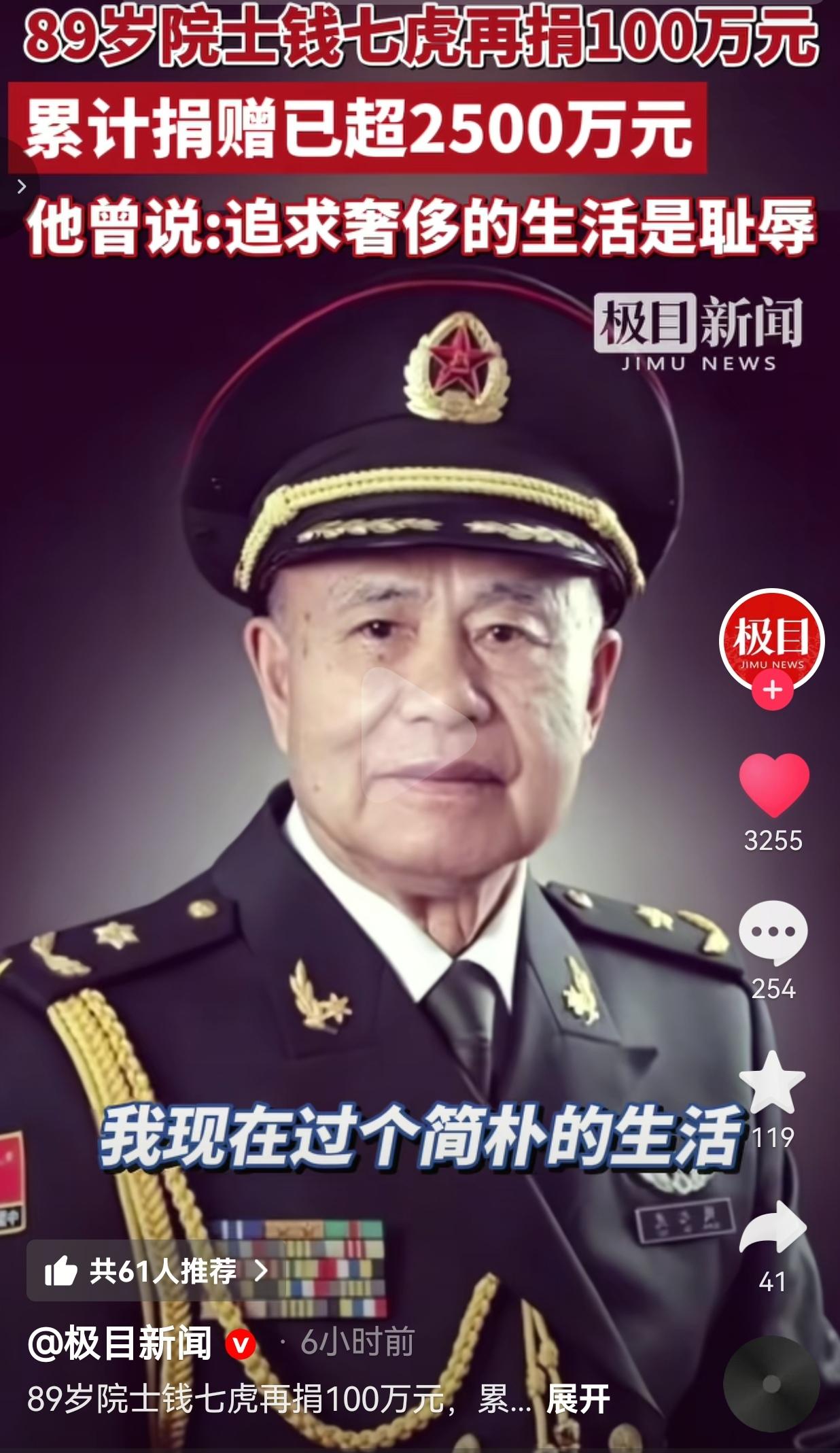 破防了!这才是真正的国之脊梁,这才是我们最该追的星! 3月30日,89岁高龄的中国工程院院士、八一勋章获得者钱七虎,再次向瑾晖慈善基金捐出100万元! 到现在为止,钱老个人累计捐款金额,已经超过2500万! 2500万是什么概念?是很多人一辈子都挣不到的钱,可钱老几乎把自己的积蓄,全捐了出去。 他捐钱,是为了资助贫困学生,为了帮助困难老人,为了让更多孩子能读书、能有出路。 可他自己呢?一辈子过得极其简朴,不讲究吃穿,不追求享受,把所有能省的钱,全都用在了最有意义的地方。 钱老说得特别戳心:“追求奢侈的生活是耻辱,这对我们党员是个耻辱。我现在过个简朴的生活,我非常安心,而且感到很幸福。” 他是为国铸盾的防护工程专家,一辈子为国家鞠躬尽瘁,到老了还在默默奉献,用自己的力量温暖更多人。 网友评论炸锅,全是敬佩与感动! 有的网友说:这才是真正的榜样!对比那些偷税漏税、炫富摆烂的明星,钱老才是我们该追的星! 也有的网友说:看完直接泪目!89岁还在捐款,一辈子为国为民,这才是中国人的脊梁! 还有的网友说:八一勋章获得者,名副其实!为国铸盾,为民捐款,钱七虎院士,永远的英雄! 也有的网友说:感谢钱老资助了那么多贫困学生,让我们有机会改变命运!您的恩情,我们永远铭记! 要我说,这才是真正的榜样,这才是信仰的力量! 现在这个社会,太多人满脑子都是搞钱、享乐、攀比,把奢侈当荣耀,把朴素当寒酸,赚了钱就挥霍炫富,一点社会责任感都没有。 可钱老呢?他完全有资格享受最好的生活,却偏偏选择了简朴,选择了奉献,把一切都给了国家和人民。 “追求奢侈是耻辱”,这句话,狠狠戳中了多少人的脊梁骨! 我们总说追星,到底该追什么样的星?不是流量明星,不是网红富豪,而是钱七虎这样为国为民、默默奉献的国之脊梁! 这才是真正的榜样,这才是中国人该有的精神信仰! 什么才是真正的富有?不是银行卡里的数字,不是身上的名牌,而是心里的担当、骨子里的善良、一辈子为国为民的初心。 钱七虎院士用2500万的捐款,用一生的坚守,给我们上了最生动的一课。 真正的高贵,从来不是财富,而是奉献;真正的荣耀,从来不是享受,而是担当。 国之脊梁,为民奉献;简朴一生,精神永存!向钱七虎院士致敬!