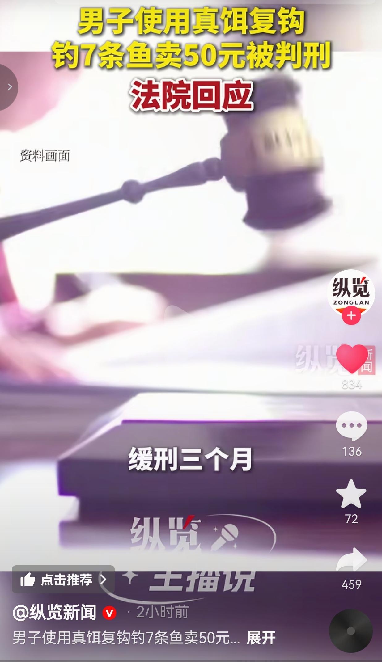 钓7条鱼卖50块钱,直接判刑2个月!法院一句话,给所有钓鱼人敲响了警钟! 事情是这样的:去年9月,四川邻水县,男子倪某揣着家伙事儿,跑到当地某河段钓鱼。 他用的是什么?真饵复钩!说白了就是多钩挂活饵,一竿下去能同时钓好几条,属于典型的“绝户钓法”,专门祸害水里的鱼资源! 就这么一折腾,倪某一共钓了7条鱼,总重4000克,也就是8斤。他转头就把这7条鱼卖了,只赚了50块钱! 结果呢?渔政工作人员巡查时,当场把正在使用真饵复钩钓鱼的倪某抓了个正着! 近日,四川省邻水县人民法院作出一审刑事判决:倪某犯非法捕捞水产品罪,判处拘役二个月,缓刑三个月! 消息一出,全网炸锅!有人说“至于吗?50块钱判刑?”,有人说“法院判得好,就是要刹住这股歪风!” 法院也明确回应了:别拿“钓几条鱼”当小事,非法捕捞就是犯罪,不管赚多赚少,只要用了禁用工具,就必须严惩! 法院明确指出,倪某的行为违反了保护水产资源法规,在禁渔区、禁渔期使用禁用工具捕捞水产品,情节严重,其行为完全符合非法捕捞水产品罪的构成要件,这不是小题大做,是依法办事! 网友看到后评论说:我就说吧!早就该管管这些用复钩、锚鱼的了!好好的野河被这些人霍霍得没鱼了,判得太轻了! 也有的网友说:我的天!50块钱换2个月拘役?这代价也太大了!以后钓鱼真得把规矩摸透,不然一不小心就犯罪了! 还有的网友说:别觉得冤!刑法早就规定了,在禁渔区、禁渔期或者使用禁用的工具、方法捕捞水产品,情节严重的,就构成犯罪!这不是小题大做,是依法办事! 要我说:别拿无知当挡箭牌,违法就是违法! 总有人抱着侥幸心理:“我就钓几条小鱼,能有什么事?”“50块钱至于判刑吗?” 我告诉你:至于!太至于了! 你用的真饵复钩,是国家明确规定的禁用渔具!这种钓法,不管大小鱼,一竿下去全给你勾上来,对水域生态是毁灭性的破坏!你今天钓7条卖50,明天就有人钓70条卖500,后天河里的鱼就被你霍霍干净了! 别拿“不懂法”当借口!不懂法不是你违法的挡箭牌!国家早就三令五申,禁渔期、禁渔区、禁用渔具,清清楚楚写在法律里!你自己不看、不学、不遵守,出事了就喊冤,纯属活该! 更可笑的是,还有人替他喊冤,说“法院量刑过重”。我就问你:如果今天不判他,明天就有更多人用复钩、用锚钩、用电鱼,把河里的鱼赶尽杀绝!到时候生态毁了,谁来买单? 法律的底线,从来不是看你赚了多少钱,而是看你犯了什么错!非法捕捞,就是在透支我们子孙后代的资源,就是在破坏我们赖以生存的环境!这种行为,就该狠狠打击,绝不手软! 别再觉得“钓鱼是小事”,别再拿“不懂法”当挡箭牌! 每一条河流,每一片水域,都是我们共同的财富,不是你用来牟利的工具!非法捕捞,从来不是“钓几条鱼”的小事,而是破坏生态、触犯刑法的大事! 法院的判决,不是为了为难谁,而是为了守住生态的底线,守住法律的尊严! 最后,我想说的是:非法捕捞零容忍,生态保护无小事!莫伸手,伸手必被抓! 对此,你怎么看?