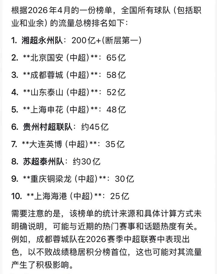 根据2026年4月的一份榜单,全国所有球队(包括职业和业余)的流量总榜排名如下: ·1.湘超永州队:200亿+(断层第一)。 ·2.北京国安(中超)**:65亿。 ·3.成都蓉城(中超)**:58亿。 ·4.山东泰山(中超)**:52亿。 ·5.上海申花(中超)**:48亿。 ·6.贵州村超联队:约45亿。 ·7.大连英博(中超)**:35亿。 ·8.苏超泰州队:约30亿。 ·9.重庆铜梁龙(中超)**:30亿。 ·10.上海海港(中超)**:25亿。 需要注意的是,该榜单的统计来源和具体计算方式未明确说明,可能与近期的热门赛事和话题热度有关。例如,成都蓉城队在2026赛季中超联赛中表现出色,以不败战绩稳居积分榜首位,这也可能对其流量产生了积极影响。