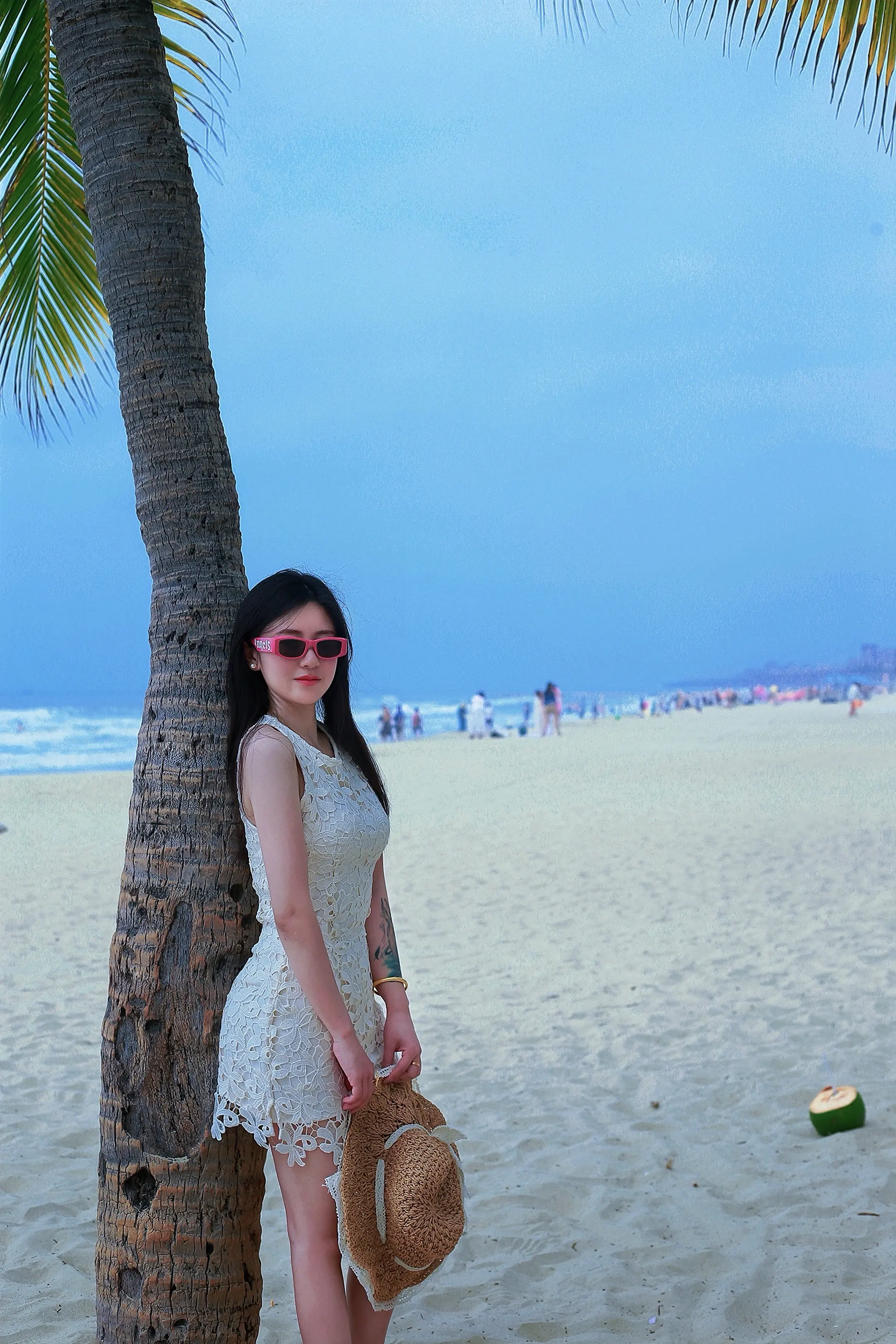 阳光沙滩,美少女漫步在棕榈树旁海边活力少女沙滩白裙少女沙滩海浪美少女沙滩上