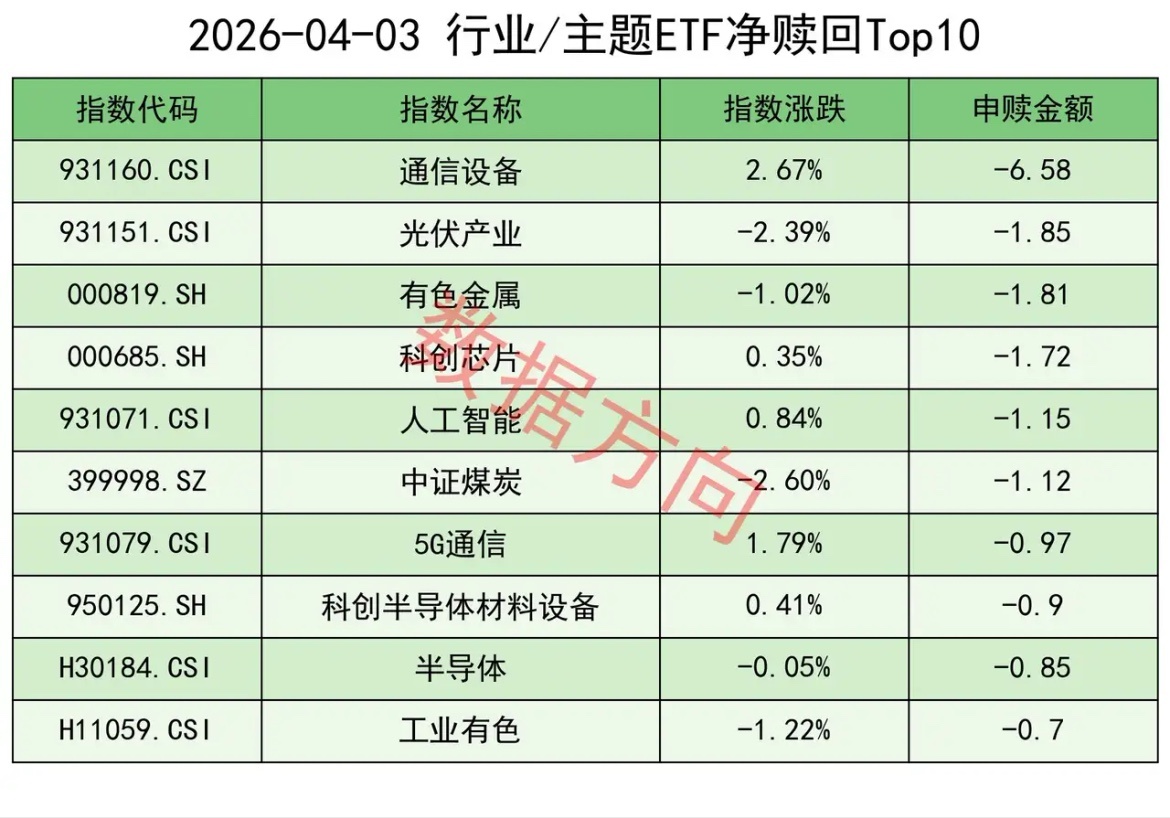 通信设备指数(-6.58亿)、人工智能指数(-1.15亿)、5G通信指数(-0.97亿),一起进入赎回榜。