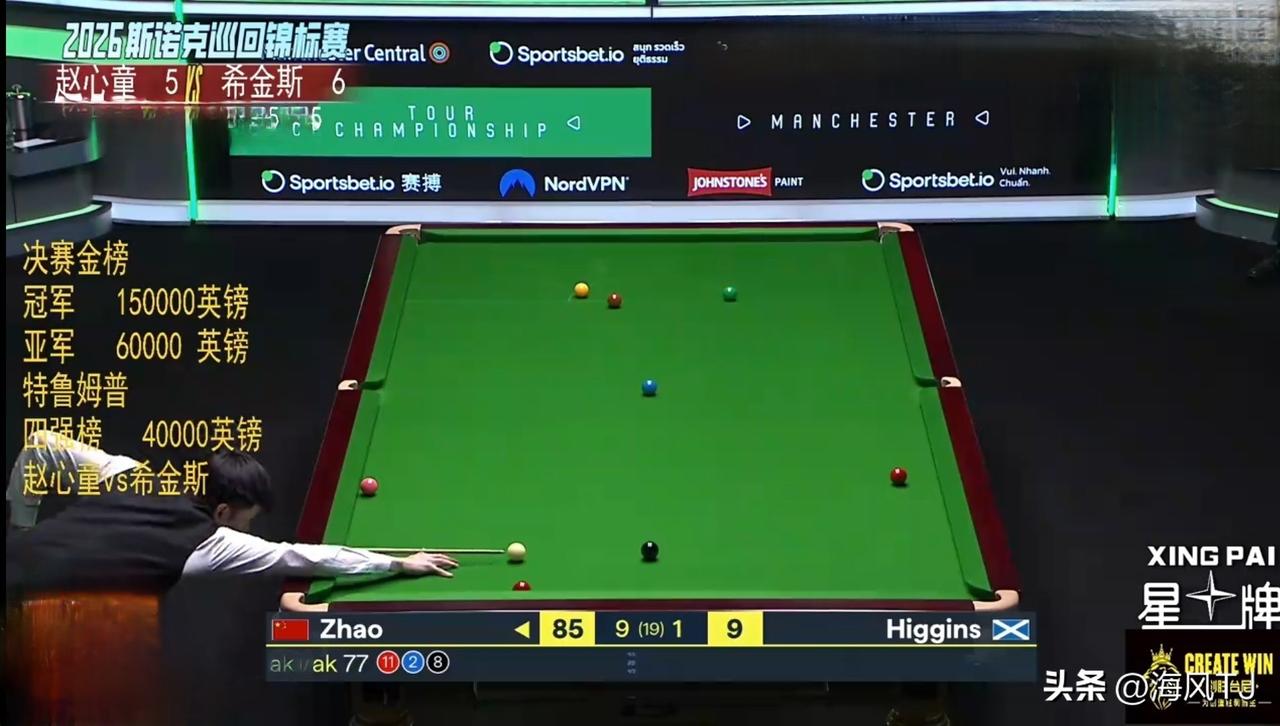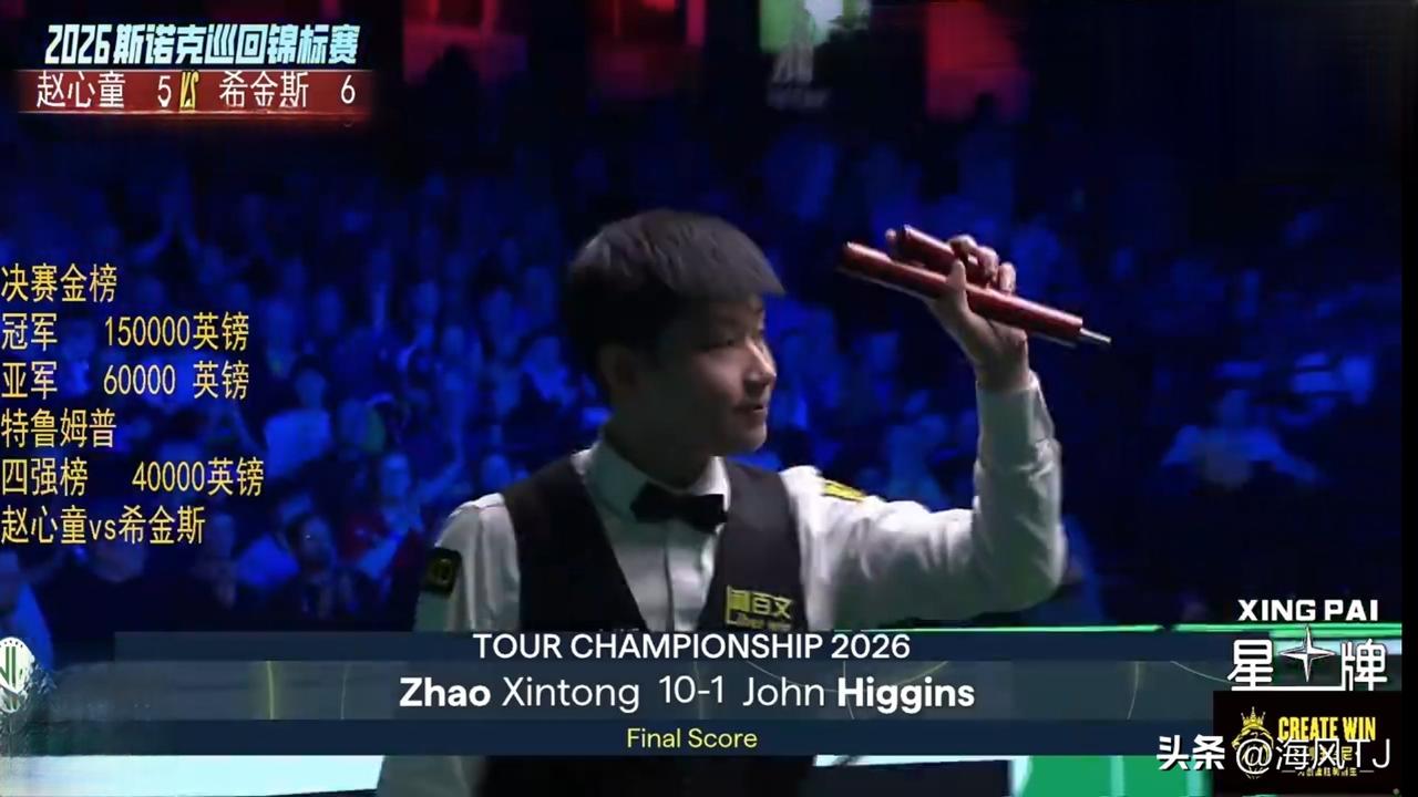 🇨🇳赵心童闯入决赛 在刚刚结束的2026斯诺克巡回锦标赛半决赛中,🇨🇳选手赵心童以总比分10:1战胜🏴老将希金斯,顺利挺进决赛。 赵心童明晚八点将与特鲁姆普争夺本届赛事的冠军。
