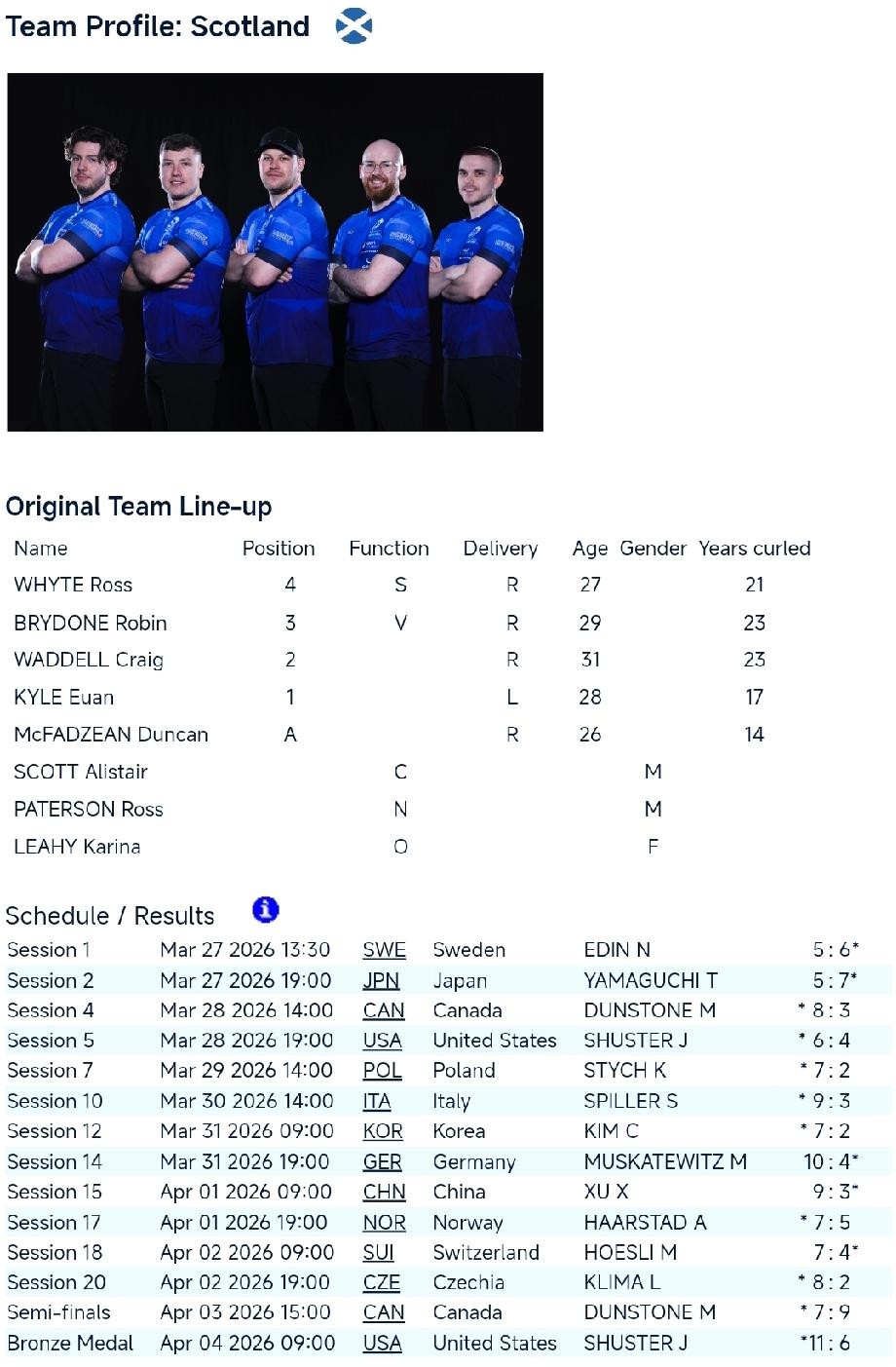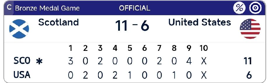 苏格兰队夺得铜牌! 北京时间4月5日凌晨,2026年男子冰壶世锦赛铜牌战结束。 世界排名第一、卫冕冠军苏格兰队11-6战胜美国队,夺得铜牌。 小组循环赛,苏格兰在先输两场的不利局面下,连赢10场,最终,排名第二晋级半决赛。半决赛,7-9不敌加拿大,无缘决赛。