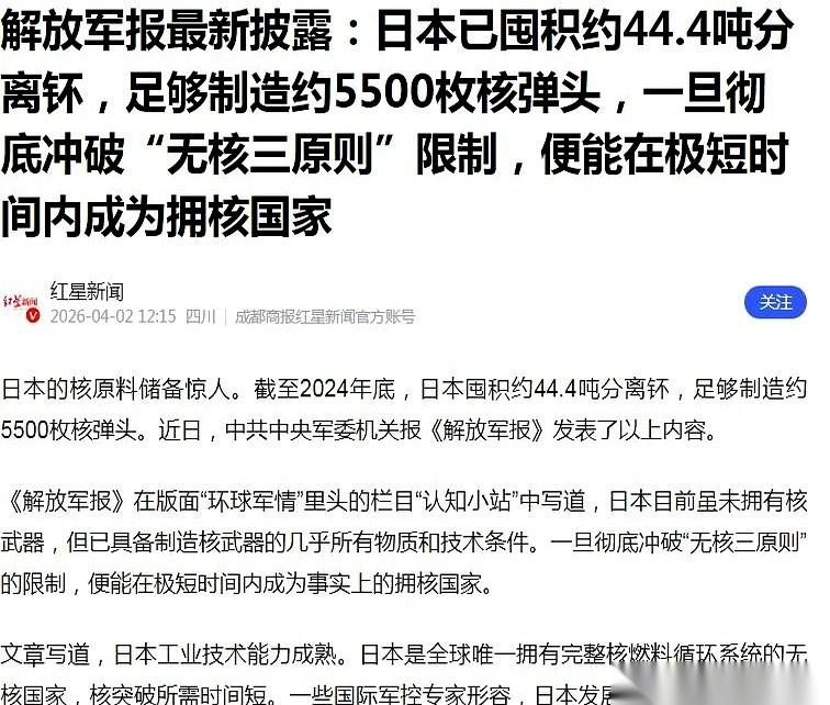 桌子底下,日本已经悄悄攒够了5500枚核弹的材料。 差的,就是一把拧螺丝的扳手。 这不是危言耸听,这是解放军报捅出来的数字:44.4吨分离钚。其中8.6吨就放在本土,剩下的,寄存在英法。 这还不算完,仓库里还码着191吨没分离的。旁边,六座大型核燃料后处理厂轰隆作响,每年还能再产出8吨武器级的好料。 这盘棋,就差最后一步“将军”。 因为日本是全世界唯一一个,偷偷把核燃料从浓缩到后处理的全套流水线都点亮了的“无核国家”。这意味着,它根本不需要从头研发,只要一道指令,就能像拧螺丝一样,快速组装出核弹头。 再配上它顶尖的电子技术、材料科学和航天能力,那画面,想想都让人后背发凉。 那根绑着它的绳子呢?那条“不拥有、不制造、不运进”的“无核三原则”呢? 早就被一点点地剪断了。 政客在国会高喊拥核,首相想着法子把“不运进”这条给删了,好让别人的核武器先进来“共享”。转身,提交给《不扩散核武器条约》的报告里,干脆连“无核三原则”这几个字都懒得写了。 每一步,都是贴着悬崖边,疯狂试探。 大洋彼岸那只鹰,非但没管,反而像个门童,亲自给这头猛兽递上了钥匙。拜登亲口承认:“日本几乎一夜之间,就能获得核武器。” 这哪里是警告,这分明就是默许的信号。 算盘打得很精:放纵日本,让它在东亚顶在最前面,自己躲在后面,生怕溅一身血。 牌,已经摊到这份上了。难道就这么眼睁睁看着? 国际原子能机构去查?制裁?技术封锁?要是这些管用,那44.4吨钚是怎么来的? 其实,还有一张被塞进历史文件柜、几乎所有人都忘了的底牌——《联合国宪章》里的“敌国条款”。 它就像一份藏在联合国档案室最深处、早已被遗忘的战后协议,一把专门为德意日等二战战败国量身打造、至今仍然没有失效的“尚方宝剑”,上面白纸黑字写得清清楚楚:一旦发现这些国家有任何重燃战火的迹象,二战的战胜国,可以不经过安理会授权,直接采取军事行动。 对,你没看错,可以直接动手。 所以,问题就变得极其简单了。是眼睁睁看着这5500枚核弹的幽灵变成现实,还是翻出那份尘封七十多年的文件,用那把生了锈的钥匙,去开那扇没人敢开的门?