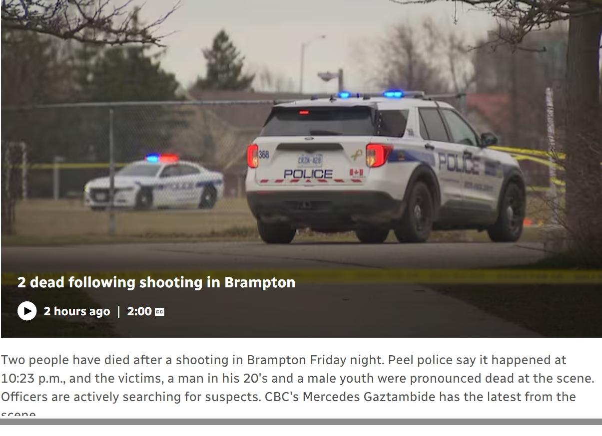 加拿大小学发生枪击事件,2人死亡,嫌疑人在逃 当地时间周五晚上10:30左右,安大略省布兰普顿的圣约阿希姆小学操场发生枪击事件,造成两人死亡。 当地警察局发言人劳里·麦肯警官表示,两名受害者,一名20多岁男子和一名青年男性被枪击,现场死亡。她说可能有多人开枪。 警方表示这些嫌疑人在警方到达前已逃离现场,目前仍在搜捕中。 麦肯说:“目前我们还不确定他们是徒步逃跑还是上了车。” 警方正在调查嫌疑人与受害者之间的关系,但认为枪击是有针对性的,并呼吁公众为警方提供线索。