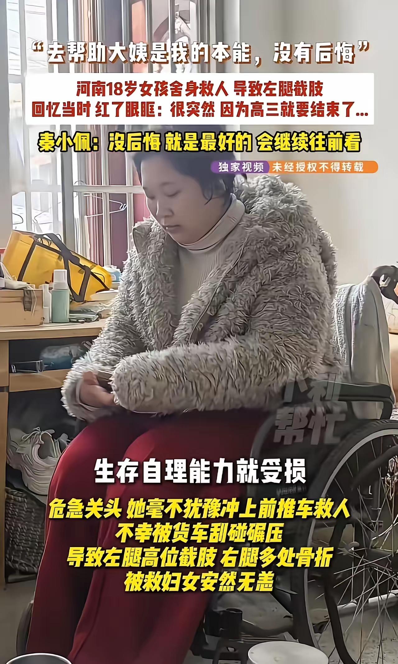 一条腿换一条命,18岁河南女孩的无悔抉择 2025年3月7日,河南上蔡县崇礼汽车站的夕阳,本该是高三学子秦小佩备考日常里最寻常的一抹暖光。那天她刚放学,背着塞满模拟卷的书包站在路边等父亲,影子被夕阳拉得很长,满心都是即将到来的高考和考上北师大当老师的梦想 。可一阵刺耳的刹车声,瞬间撕碎了这份平静,也改写了她的人生轨迹。 前方,一名妇女推着电动三轮车躲避驶来的载重货车,本想奋力将车推上坡道避险,三轮车却失控反向下滑,直直冲向货车车轮 。千钧一发之际,秦小佩脑子里“嗡”的一声,所有关于高考、学业的念头都被抛到九霄云外,只剩下救人的本能。她猛地扔下书包,像离弦的箭般冲过去,双手死死扣住三轮车后座,拼尽全身力气往前推,嘶吼着让妇女快躲开。 碰撞声轰然响起,巨大的冲击力将三轮车撞飞,秦小佩来不及躲闪,被狠狠掀翻在地。货车右后轮重重碾过她的双腿,剧痛席卷全身,她瞬间失去了意识 。等再次醒来,白色的病房、刺鼻的消毒水味,以及医生那句“左腿高位截肢,右腿四处粉碎性骨折”,成了她不得不面对的现实 。而那个被她救下的妇女,安然无恙 。 回忆起当时的情景,秦小佩的眼眶不自觉泛红。“高三就要结束了,我还想考大学呢。现在截肢了,走路、生活都受影响,说不难过肯定是假的。”可话音刚落,她的眼神便变得无比坚定,“但一条腿换一条命,我没有后悔,去帮助大姨是我的本能,我会继续往前看!” 这份坦然与坚韧,早已刻进她的骨子里。秦小佩出生在秦庄村一个贫寒家庭,自幼由奶奶抚养长大,奶奶去世后,便与父亲秦国喜相依为命 。生活的拮据从未让她抱怨命运,反而让她比同龄人更懂事、更坚强。出事前,她省吃俭用,舍不得买新衣服,却把攒下的零花钱全用来买辅导书,一心朝着教师梦努力。 意外发生后,她经历了7次手术,在病床上躺了五个多月,又用近七个月时间做康复训练。父亲看着她承受的痛苦,满心愧疚与心疼,可秦小佩从未在家人面前沉溺于悲伤。2025年6月,高考如期而至,她坐着轮椅,忍着伤口的剧痛走进考场,最终考出384分 。虽然没能如愿踏入大学校门,但她没有放弃,在家坚持自学,从未熄灭对知识的渴望。 命运以痛吻她,她却报之以歌。2025年12月,秦小佩被评为上蔡县“见义勇为先进个人” ;2026年3月,中央政法委发布2026年第一季度见义勇为勇士榜,全国64位勇士中,河南仅3人上榜,18岁的她是其中最年轻的一位。荣誉加身,她依旧谦逊,只说自己做了该做的事 。 2026年4月1日,距离高考仅剩两个月,秦小佩重返阔别一年的校园。学校为她腾出一楼宿舍,配备独立洗漱间,免去她行动不便的困扰;同学们自发成立“护学小组”,轮流帮她打饭、拿书、推轮椅;教室黑板上,“欢迎小佩回家”五个大字格外醒目。走进教室的那一刻,秦小佩笑着说:“我的人生又开始了。” 她的事迹传开后,网友们议论纷纷。有人心疼她的遭遇,感慨“勇敢的代价太大”;有人呼吁大学破格录取,认为她在人性考场上早已交出满分答卷;也有人质疑她“太冲动”,觉得“不值得”。 可正如人们所说,秦小佩冲上去的那一刻,没有权衡利弊,没有计算得失,只是出于最纯粹的善良与本能。如果每个人都要先算清楚“值不值”再伸手,这个世界便会失去最珍贵的温度。她失去了一条腿,却站得比谁都挺拔;她暂时没能考上大学,却用行动通过了人生最重要的考试。 真正的教育,从来不止是传授知识,更是教人在危难时刻敢于挺身而出。秦小佩用18岁的担当,诠释了善良的模样;用残缺的身躯,走出了令人仰望的高度。她不需要同情,只值得我们每一个人致敬——致敬这份义无反顾的勇敢,致敬这份向阳而生的坚韧。