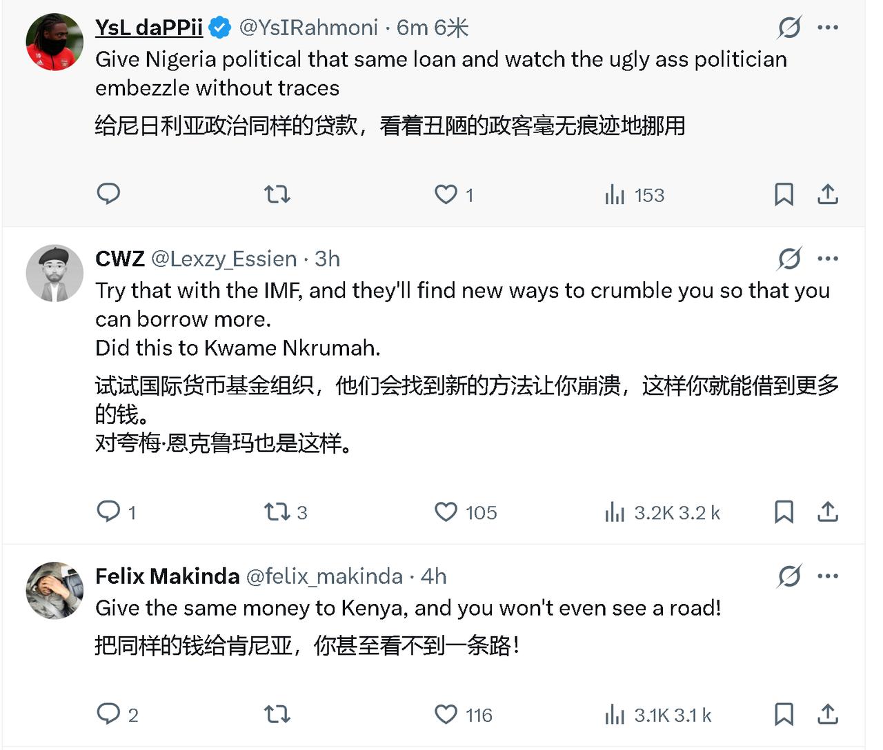 非洲传媒发帖说:2022年,东大向卢旺达提供了一笔贷款,用于在基加利修建一条6.36公里长的公路。当东大看到卢旺达很好地利用了这笔贷款,道路建造的很好,东大取消了卢旺达710万美元的债务。 孺子可教也,只要你真正的把借款用于民生实事,而不是中饱私囊,说明你这个国家有前途,我们就会鼎力相助。 一些非洲网友评论说: 给尼日利亚同样的贷款,丑陋的政客会毫无痕迹地挪用。 把同样的钱给肯尼亚,你甚至看不到一条路! 如果是国际货币基金组织,他们会找到新的方法让你国崩溃,这样你国就需要借更多的钱,他们对夸梅·恩克鲁玛就是这样。 国际货币基金组织更像是紧急经济状况下的“救火队员”。然而,其“救援”往往附带着一套严格的紧缩方案,要求借款国实事严苛的结构性改革,这正是争议的核心。IMF在提供贷款时,通常会要求借款国实施一系列“结构性调整计划”。这些改革常被批评为推行新自由主义经济政策,包括要求政府削减公共开支、国有企业私有化、货币贬值等。这些紧缩措施在实施过程中,往往会带来严重的社会阵痛。例如,在肯尼亚,IMF为贷款提出的增税条件,直接点燃了2024年大规模的致命抗议。突尼斯总统赛义德更是将IMF的条件比作“将火柴扔在炸药上”。许多人批评,这些条件不仅削弱了国家主权,还可能加剧贫困,而非根除它。更令人诟病的是,IMF的干预模式常常导致一种“依赖-危机-再依赖”的恶性循环。以加纳为例,自1966年首次求助于IMF以来,已先后17次向该组织申请援助,平均每3.5年一次。现任总统在2026年初甚至立下誓言,试图打破这一宿命。讽刺的是,IMF的贷款还常常流向那些本就债务不可持续的国家。肯尼亚教授罗格夫就曾以加纳为例,指出IMF明知其2021年已陷入债务困境,却仍为其提供贷款;到2023年,甚至又在加纳债务被判定为“不可持续”的情况下,追加了30亿美元的援助。 夸梅·恩克鲁玛是加纳独立后的首位总统,也是泛非主义的旗手,他致力于通过大规模工业化项目,建设一个自力更生的社会主义加纳。然而,他雄心勃勃的发展计划,很快因国际市场价格波动和外汇储备枯竭而陷入财政危机。1966年,就在恩克鲁玛寻求IMF援助之时,一场军事政变将他推翻。政变后,军政府迅速邀请IMF和世界银行介入。新政府随后接受了IMF的条件,大规模变卖了恩克鲁玛时代建立的国有企业。因此,在很多非洲知识分子和民众心中,恩克鲁玛的倒台并非单纯的军事政变,而是一场由西方大国及其控制的国际金融机构精心策划的“经济暗杀”。这解释了为何网友会将恩克鲁玛的遭遇与IMF的破坏力联系起来——他成为了国家经济主权被国际金融体系绑架的牺牲品。