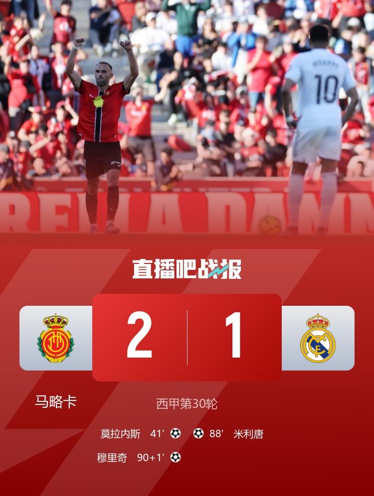 爆冷!皇马1-2遭马略卡绝杀皇马各赛事5连胜终结、落后榜首7分