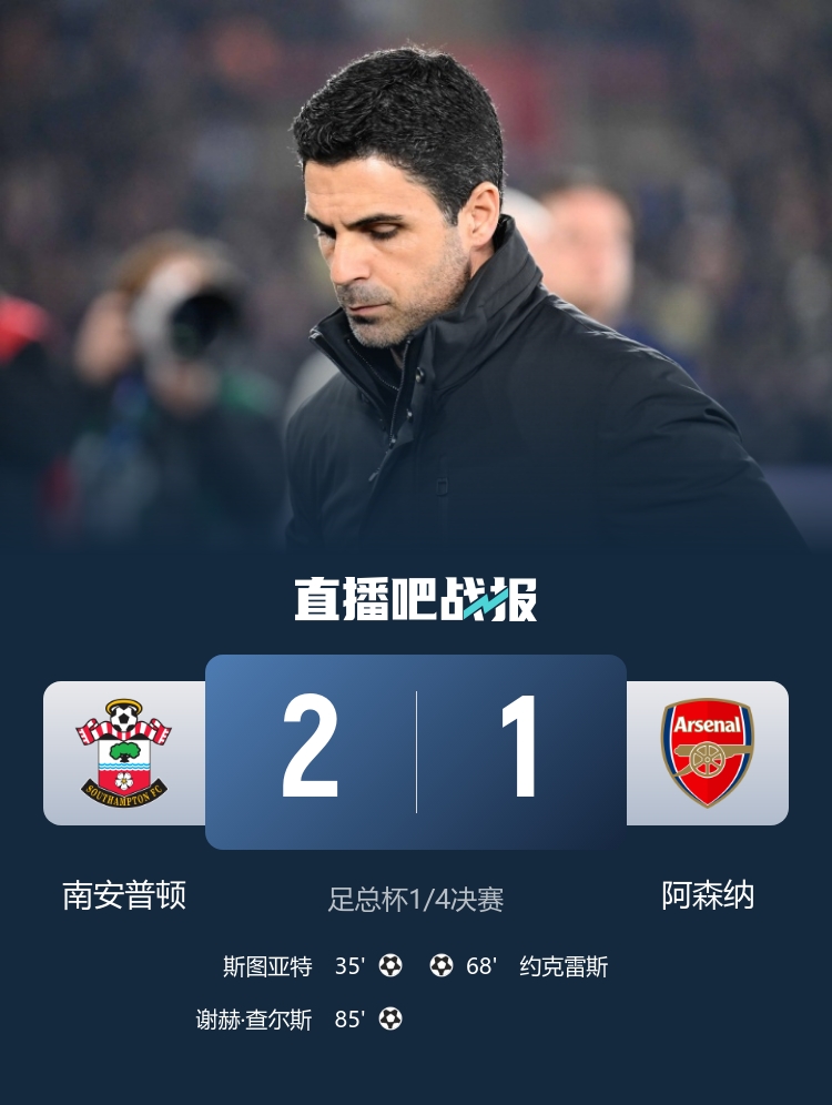 爆冷!阿森纳1-2圣徒止步足总杯八强约克雷斯破门难救主加布伤退