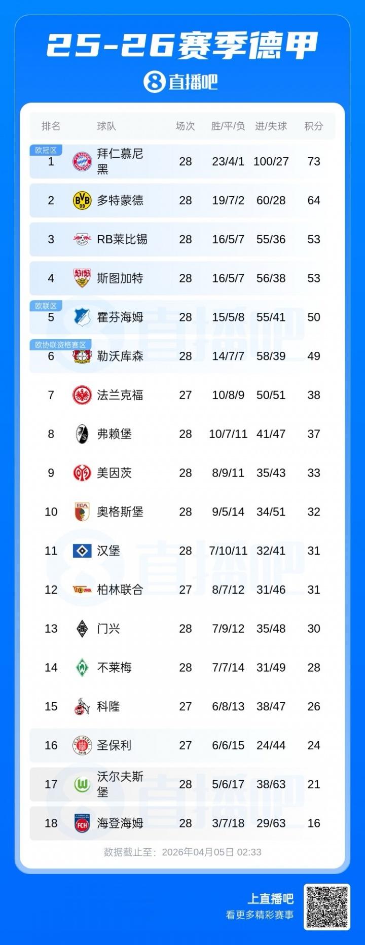 还有悬念吗?德甲积分榜:多特补时两球险胜,剩6轮距拜仁9分