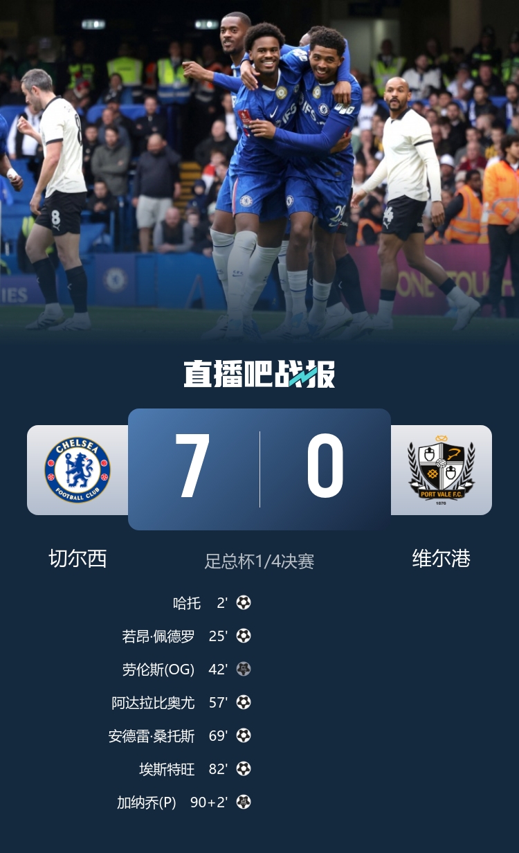 止4连败!切尔西7-0大胜维尔港进足总杯4强埃斯特旺传射+两中柱