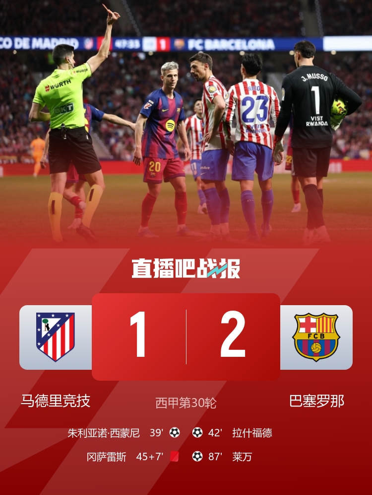 莱万绝杀!巴萨2-1逆转十人马竞冈萨雷斯1黄1直红马丁直红改黄牌