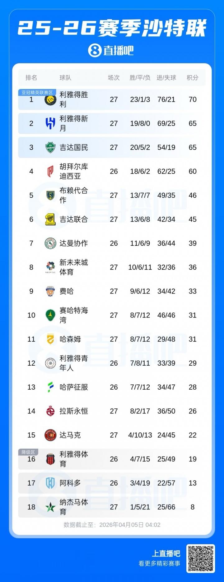 还剩7轮!沙特联积分榜:胜利5分优势领跑,新月三连胜终结