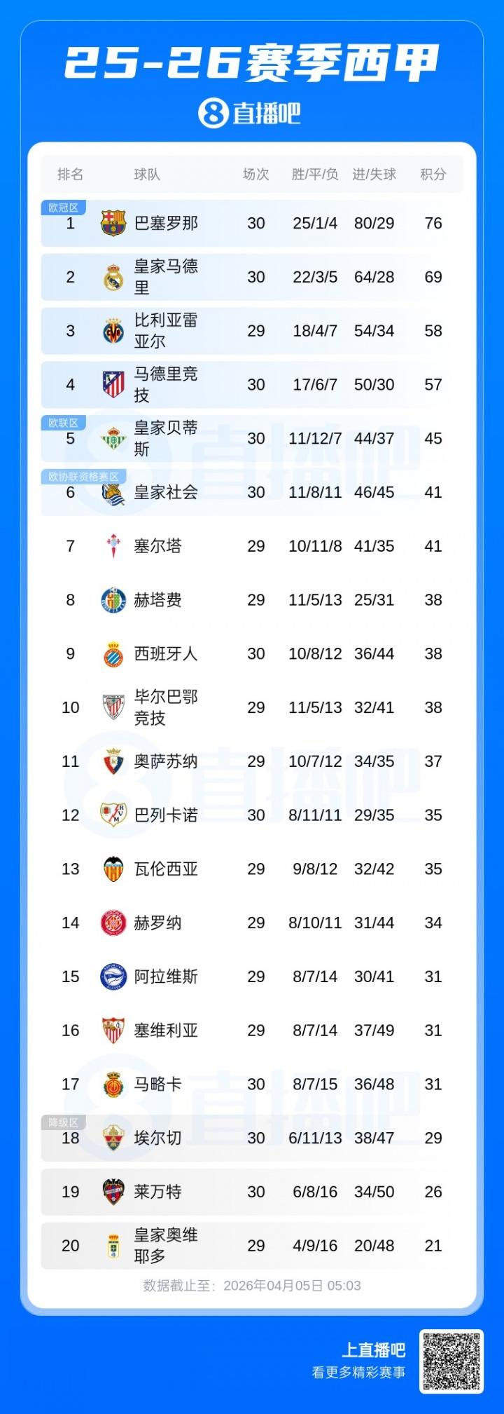 西甲积分榜:巴萨绝杀马竞7分优势领跑皇马本轮先赛被马略卡绝杀
