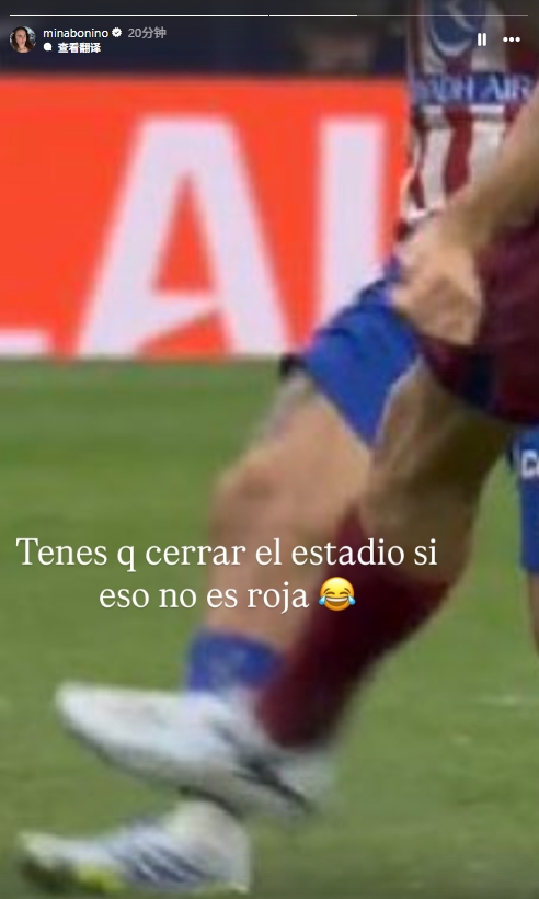 对于马丁蹬踏未吃红牌,巴尔韦德妻子Mina下半场进行时在个人社媒发布快拍:“如果这动作都不是红牌的话,那体育场可以直接关门了。”