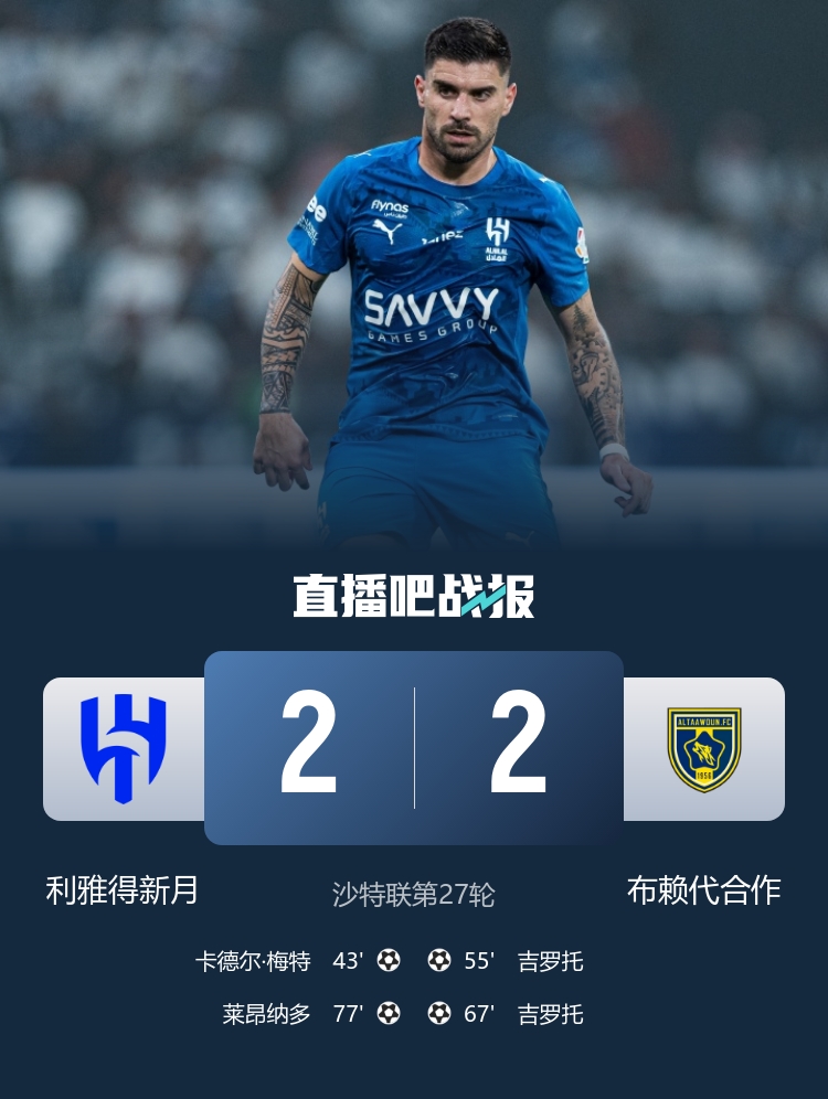 3连胜终结!利雅得新月2-2布赖代合作距榜首5分梅特莱昂纳多破门