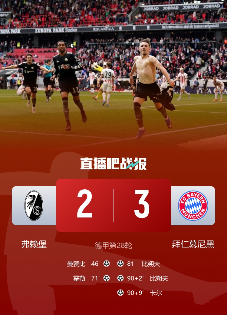 让二追三!拜仁3-2逆转弗赖堡先赛12分领跑比朔夫双响卡尔绝杀