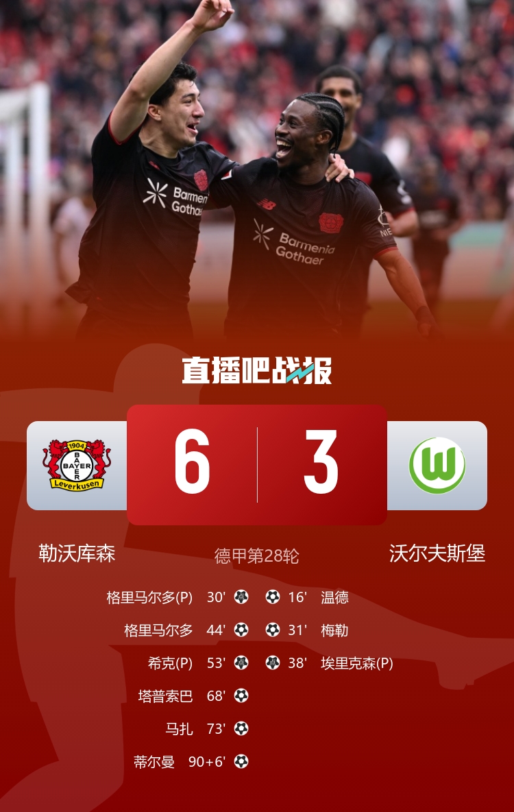 勒沃库森1-3落后连入5球逆转,继续排名第6,沃尔夫斯堡仍处降级区;格里马尔多双响。