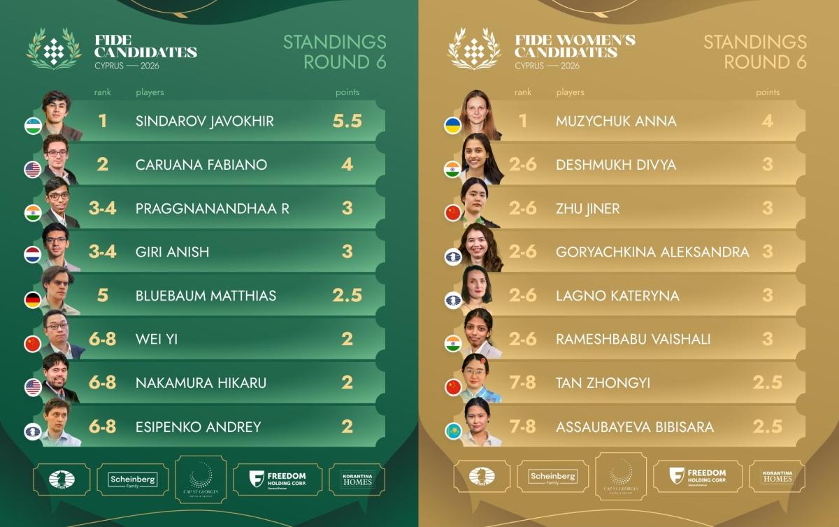 第六轮一平两负! 国际象棋世界冠军候选人赛战罢第六轮,中国棋手发挥欠佳,韦弈不敌辛达罗夫、朱锦尔不敌安娜·穆兹丘克、谭中怡战平戈尔亚奇金娜。 积分榜: 辛达罗夫和安娜穆·兹丘克位居榜首。 第七轮对阵: 韦弈对阵艾西彭科 朱锦尔对阵戈尔亚奇金娜 谭中怡对阵瓦伊莎莉