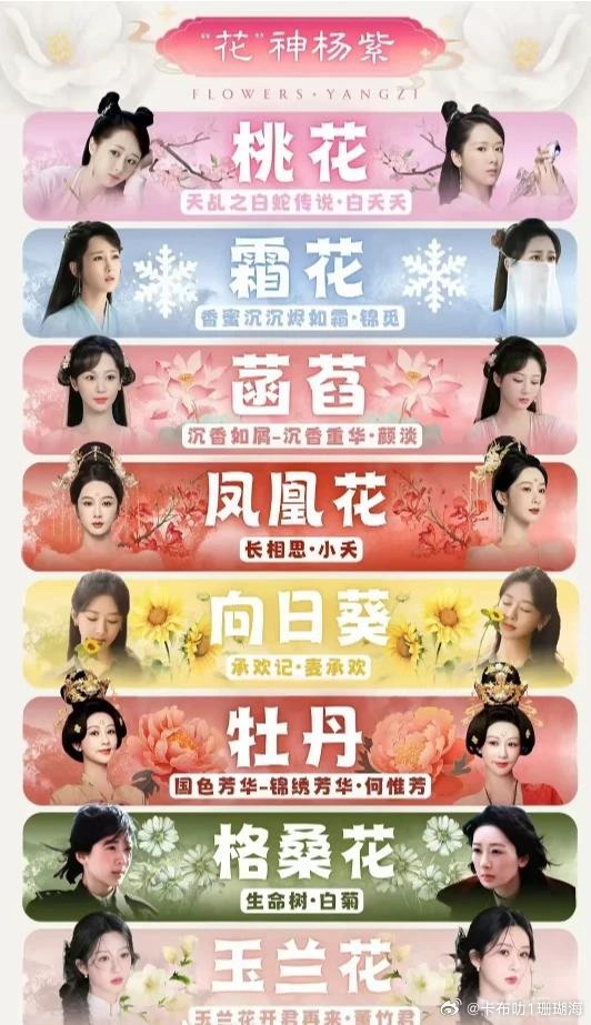 北京国际花展神秘大使就要官宣了,都是精品邂逅更懂你的花神之美1. 锦觅《香蜜沉沉烬如霜》代表花:霜花|花语:纯净通透,历经寒霜终得圆满2. 颜淡《沉香如屑》代表花:菡萏(莲花)|花语:清雅圣洁,坚韧温柔,宁折不弯3. 白夭夭《天乩之白蛇传说》代表花:桃花|花语:灵动烂漫,深情执着4. 小夭《长相思》代表花:桃花(驻颜花)、凤凰花|花语:坚韧自愈,热烈重生5. 何惟芳《国色芳华》代表花:牡丹|花语:国色芳华,独立自强,雍容大气6. 麦承欢《承欢记》代表花:向日葵|花语:向阳而生,独立清醒,追逐光亮7. 白菊《生命树》代表花:白菊、格桑花|花语:坚韧纯粹,坚守初心8. 李祯《祯娘传》代表花:兰花|花语:清雅内敛,聪慧有风骨9. 董竹君《玉兰花开君再来》代表花:玉兰花|花语:高洁坚贞,优雅不屈。