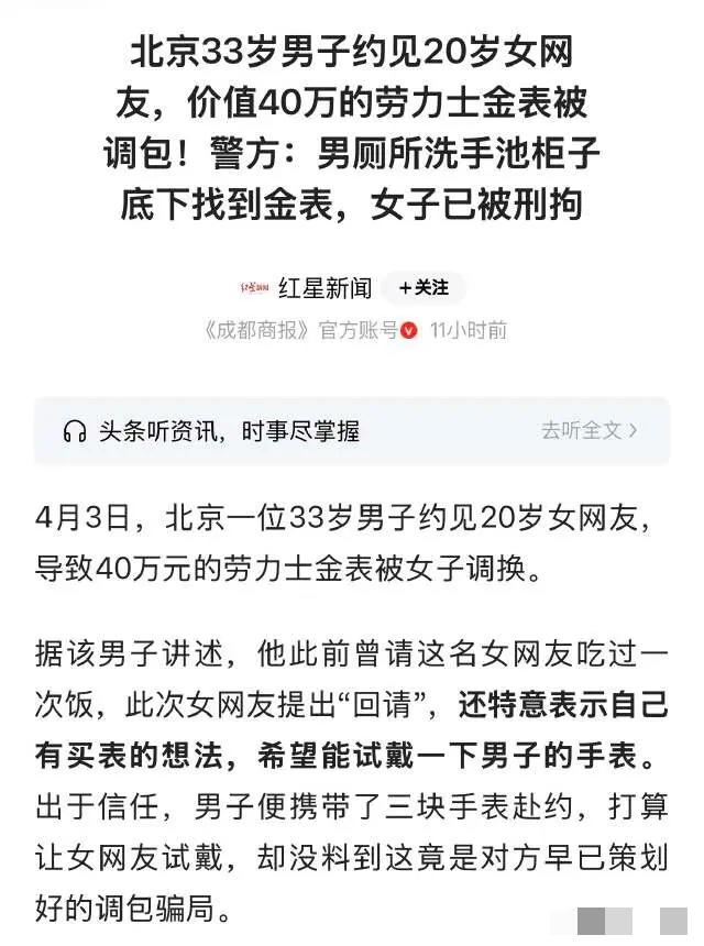 “一个贪财、一个好色。”北京,一个33岁的男子,经不住网上一个女子的引导,急着线下见面。男子摆阔带着40万元的大劳,女子瞬间就两眼冒光。吃完饭女子提出回请,主动给了男子价值1000元的礼物,之后提出想要看看男子的大劳,没想到,趁男子不注意,女子拿出网购300元的赝品,给男子来了个“狸猫换太子”,事后男子才发现被掉包,赶紧报了警。 33岁的刘先生在网上认识了一个20岁的女网友,俩人聊得挺热乎。之前刘先生请她吃过一次饭,这回女方主动说要“回请”,还说自己最近也想买块表,让刘先生帮忙参谋参谋。 刘先生没多想,觉得这姑娘挺懂事。赴约的时候,他特意带上了自己收藏的三块手表,其中就有一块价值四十万的劳力士金表,想着让人家好好看看。见面后,女方果然送了他一份价值一千块钱的礼物,说是感谢上次请客。 聊到手表,女方自然提出想试戴一下。刘先生大方地摘下表递了过去。就在他稍微分神的一小会儿,女方用早就准备好的、在网上花三百块买的假劳力士,把真表给换走了。动作快得让人察觉不到。 分开之后,刘先生越看越觉得手上这块表不对劲,分量轻,做工也糙。他这才恍然大悟,自己被人给“套路”了。四十万的东西就这么没了,他赶紧打电话报警。 警察来了,仔细问了经过,又调了监控。很快就锁定了那个女网友。让人没想到的是,警察最后在见面地点一楼男厕所的洗手池柜子底下,找到了那块被抹布包着的真劳力士。原来这女的调包成功后,自己也没敢立刻带走,先藏在了男厕所,想着等风头过了再拿。 现在这个20岁的女网友已经被刑事拘留了,案子还在办。一块四十万的表,被三百块的假货换掉了,这账怎么算都是血亏。 网上有人说这是一个“贪财”遇上了“好色”,男的想炫耀,女的实际是看上了他的表。其实说到底,是网络交友里那点不切实际的幻想和轻易付出的信任,碰上了处心积虑的算计。一顿饭、一份礼物,就成了打开别人保险箱的钥匙。 虚拟世界里的热情,到了现实里,可能包裹着各种各样的目的。不是说不该真诚,而是那份信任,需要时间慢慢给,更需要一点基本的警惕心。 贵重物品最好别轻易交到认识不久的人手里,你以为的慷慨和信任,在别有用心的人眼里,可能就是最好下手的机会。再精密的算计,也绕不过法律和监控,贪图不属于自己的东西,最后搭进去的,往往是整个人生。 各位读者你们怎么看?欢迎在评论区讨论。 消息来源:红星新闻