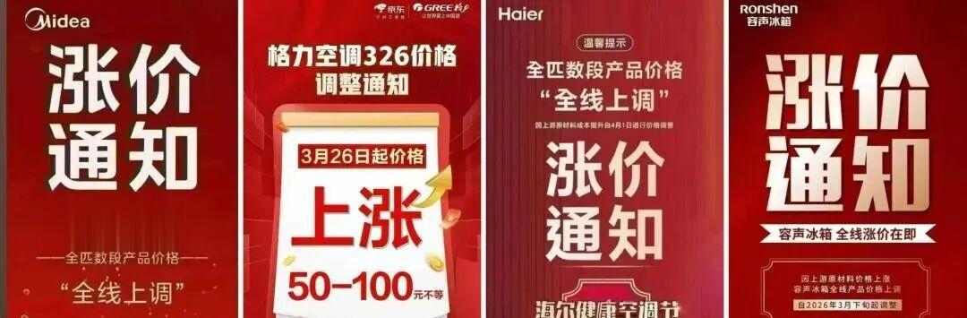 多个家电品牌近期发布的涨价通知。