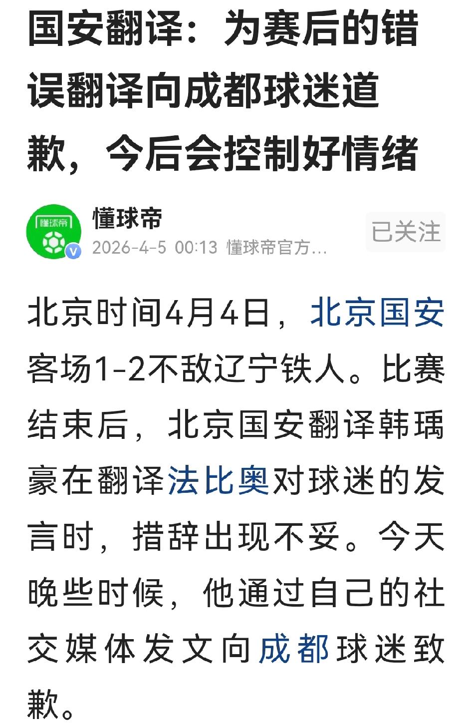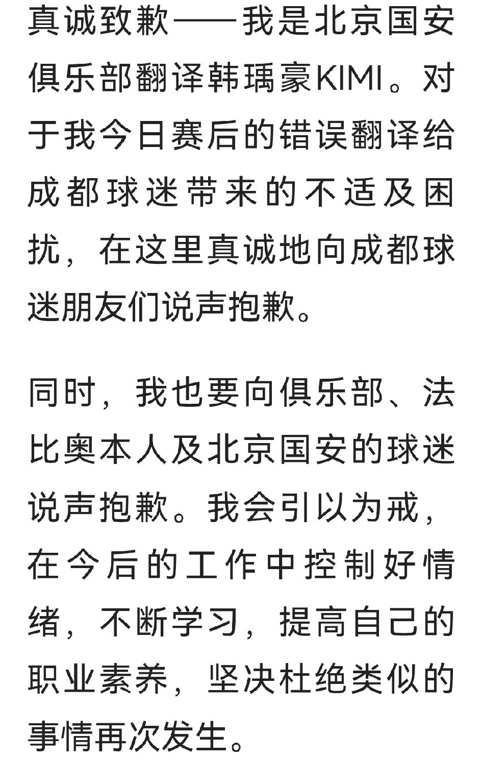 国安队翻译韩瑀豪向成都球迷、法比奥和国安球迷道歉,我认为这态度可以。两支球队、两