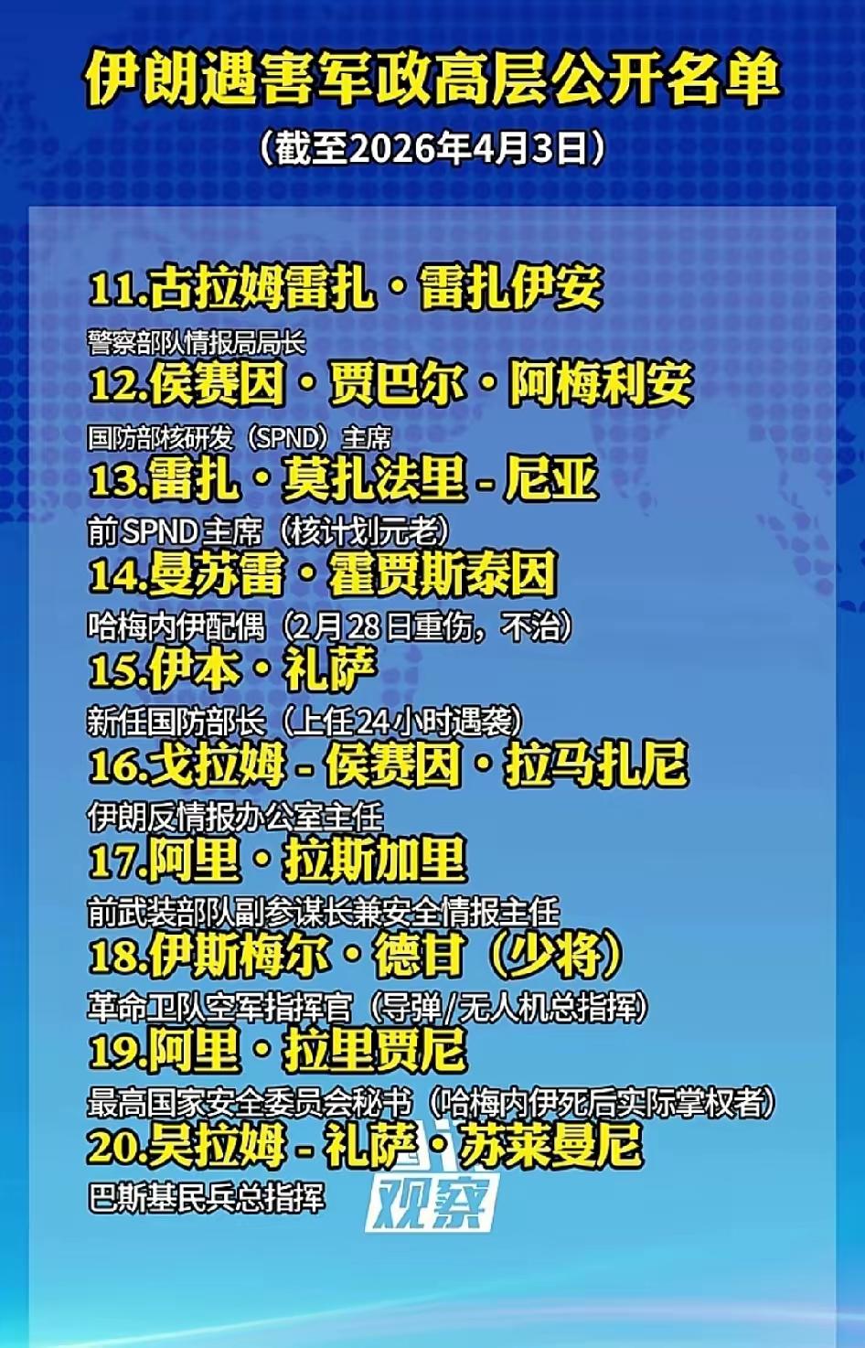 伊朗被斩首高官公开名单被公布!这里涵盖了伊朗包括哈梅内伊在内的军政教各类高级人员,其中国防部长就已经被斩首两次! 那么问题来了,伊朗的总统、议长、外长至今仍经常公开露面,却安然无恙,这到底是以色列的仁慈,还是确实他们运气好,伊朗还是好好查查!