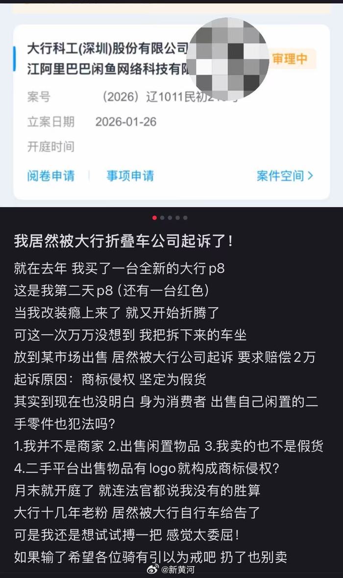【#男子卖50元二手坐垫被索赔2万#】4月4日,一起围绕二手交易的维权案件在骑行圈迅速发酵。辽宁一名消费者因在闲鱼以50元转卖自行车坐垫,被折叠车品牌大行以商标侵权为由起诉,索赔金额达到2万元。该消费者告诉新黄河记者表示,案件将于本月27日开庭。