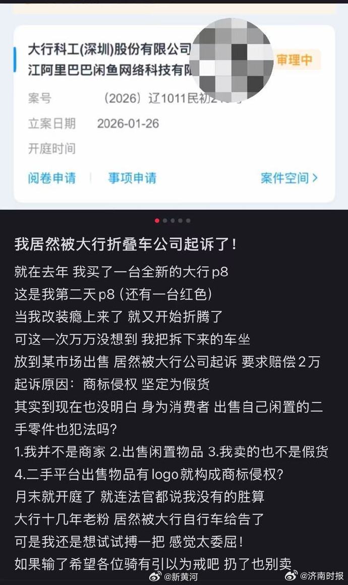 【#男子卖50元二手坐垫被索赔2万#】4月4日,一起围绕二手交易的维权案件在骑行圈迅速发酵。辽宁一名消费者因在闲鱼以50元转卖自行车坐垫,被折叠车品牌大行以商标侵权为由起诉,索赔金额达到2万元。该消费者告诉新黄河记者表示,案件将于本月27日开庭。