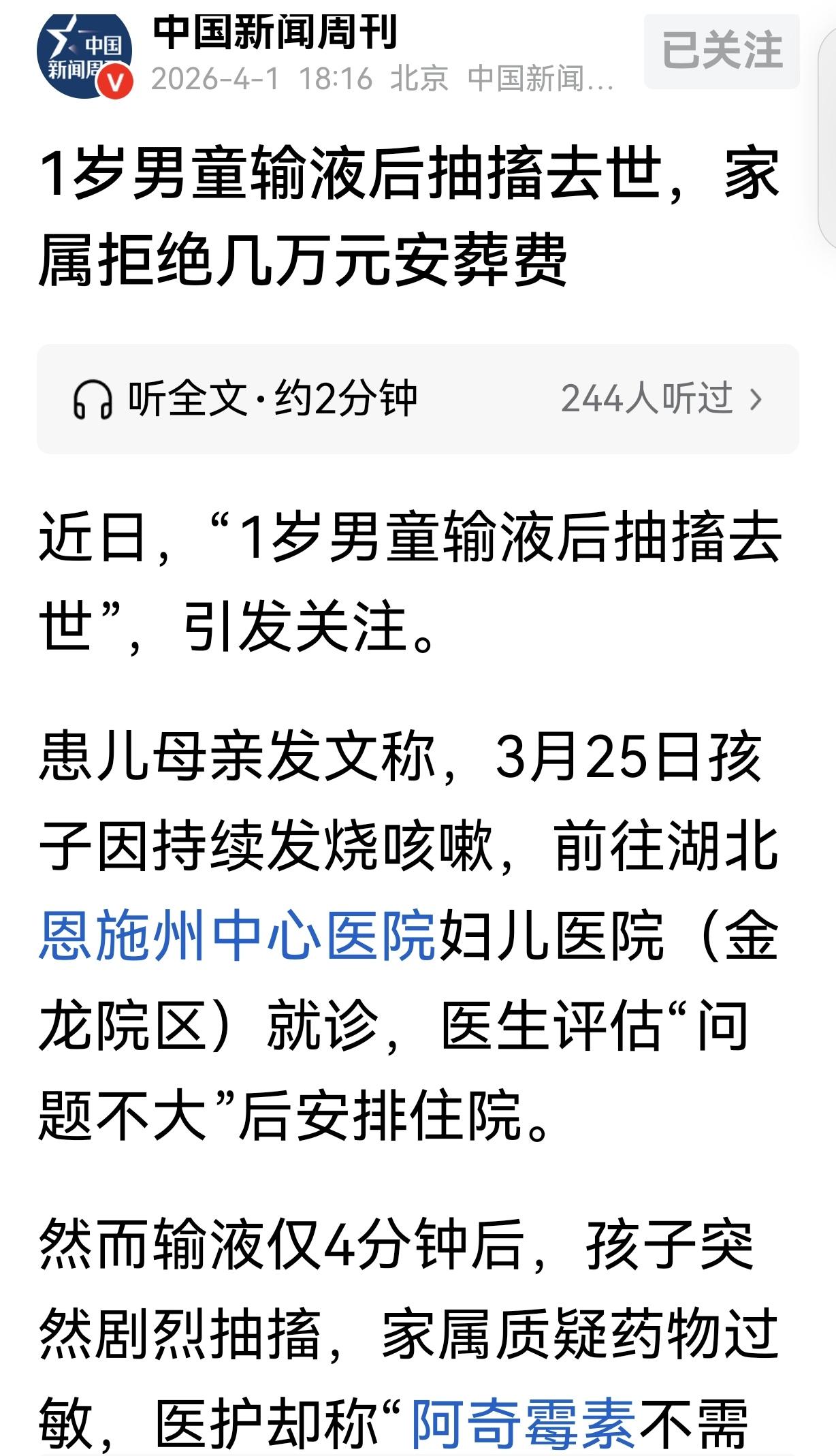 湖北恩施,一女子1岁的儿子,持续发烧咳嗽,她带儿子去医院,医生说问题不大,安排住院,输液前说“阿奇霉素不需皮试”,儿子输液只4分钟后,突然剧烈抽搐,抢救无效死亡,女子一口咬定药物过敏,拒绝几万元安葬费,坚决等待尸检结果,为儿子讨回公道。 谁也没想到,一句“问题不大”,竟成了一位母亲与1岁幼子的生死诀别。这份看似寻常的诊断,将一个满怀希望的家庭瞬间推入深渊。更让人揪心的是,悲剧发生在医疗程序看似合规的前提下,这让所有为人父母者都感到一阵彻骨的寒意。 孩子此前已因肺炎在其他医院接受过治疗,但病情并未完全根除。母亲带着持续发烧咳嗽的孩子,特意选择了当地权威的恩施州中心医院,并挂了专家号。她只想查明病因,让孩子彻底痊愈。 医生简单检查后,便给出了“问题不大”的结论,并建议住院观察。这位母亲信任专业的判断,同意住院,她以为这是孩子康复的起点,未曾想竟是通往终点的路口。 一系列常规检查后,当天下午1点,护士开始为孩子静脉输液,并告知使用的药物是阿奇霉素。作为临床常用药,阿奇霉素的说明书确实注明无需常规皮试,这也成了医护人员的操作依据。 但谁也无法预料,致命的危机正潜伏在这看似安全的输液管中。仅仅4分钟,悲剧毫无征兆地爆发。原本安静的孩子突然开始剧烈抽搐,生命体征急转直下。 惊慌的家属立即呼救,但赶来的医护人员初步判断却让家属坠入冰窖。他们称“阿奇霉素不需皮试”,初步判定“不是过敏”,甚至认为“抽搐很正常”,并为孩子注射了镇静剂。 这种基于“经验主义”的初步判断,可能错失了最宝贵的抢救黄金时间。随后,孩子状况急剧恶化,嘴唇发紫,手脚发白。当ICU医生最终赶到时,孩子已经没有了心跳。一条稚嫩的生命,在输液4分钟后,永远定格。 事发后,医院提出给予几万元安葬费,希望先行处理后事。但这位母亲拒绝了。她无法接受孩子不明不白地离去,更无法认同“无需皮试”就可以掩盖一切疑点。 她心中只有一个念头:为死去的儿子讨一个公道。她坚信是药物过敏夺走了孩子,拒绝任何形式的“私了”或安抚,坚持要等待尸检报告,用最科学、最权威的方式还原真相。 目前,当地卫健委已介入调查,患儿的病历与监控录像已被封存。医患双方已共同委托第三方机构进行尸检,鉴定结果预计需要一至两个月。所有人都在等待这份能揭开真相的报告。 这起悲剧并非孤例。近年来,儿童因输液引发严重不良反应的事件屡有发生。2026年初,贵阳一名1岁女童因使用阿奇霉素后陷入昏迷,最终成为植物人。2023年底,山东一名6岁男童在输注头孢类药物后,因过敏性休克抢救无效死亡。 这些案例指向一个共同的核心:无需皮试,绝不等于零风险。阿奇霉素等药物虽过敏率低于青霉素,但并非不存在。儿童体质特殊,神经系统尚未发育完全,对药物的耐受性个体差异极大,任何药物都可能诱发罕见但致命的反应。 医疗行业的常规操作,不应成为麻痹大意的借口。尤其是面对无法表达感受的婴幼儿,医护人员更应保持最高等级的警惕。输液前的详尽评估、用药初期的低速滴注、全程的严密监护,以及急救药品与设备的随时待命,这些才是安全用药的真正基石,而非仅仅依赖“无需皮试”的说明书。 这位母亲拒绝几万元安葬费的选择,看似固执,实则是对生命尊严最悲壮的捍卫。她不要带有安抚性质的补偿,她要的是一个明确的答案,一个公正的责任认定。 她的坚持,不仅是为了自己的孩子,更是为了警醒所有医疗机构和从业者:在生命面前,任何经验主义都可能酿成大祸,任何一丝疏忽都可能摧毁一个家庭。 医疗安全的防线,从来都不是建立在“概率”之上,而是构筑在每一个环节的严谨、每一次判断的审慎和每一秒的绝不松懈之中。 一条幼小生命的逝去,留下的是无尽的悲痛与沉重的反思。我们期待尸检结果能早日还原真相,更期待所有医疗从业者能以此为戒,将“安全”二字刻进每一次诊疗的细节里。 面对这样的悲剧,我们除了心痛,更应追问:当“常规操作”遭遇“罕见悲剧”,我们该如何筑牢儿童用药的安全防线?你认为,医疗机构还能做些什么,来避免类似的悲剧再次发生?