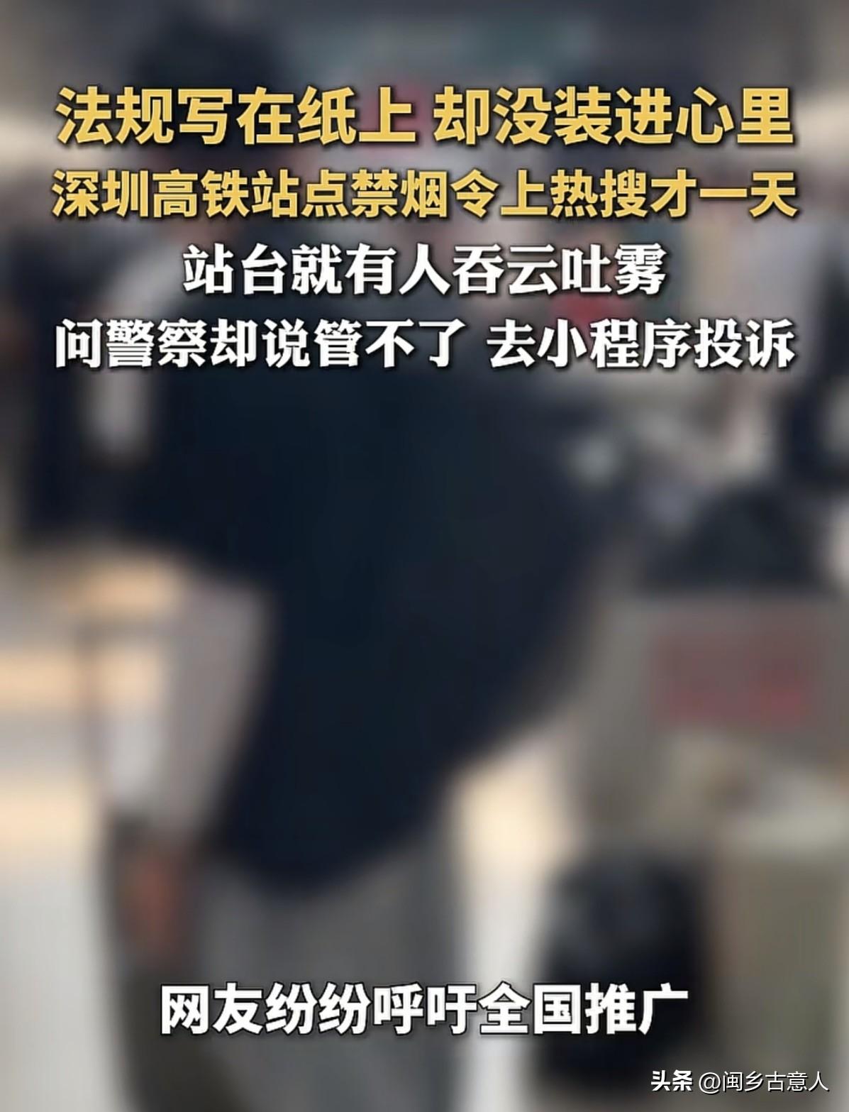 全国其他地方的网友都希望能向深圳学习,在高铁站台全面禁止吸烟,甚至有人说他吸的二手烟,全来自高铁站台! 但现今有点尴尬,虽然深圳规定了高铁站台禁止吸烟,却还是有烟民我行我素,无视法规,依然在深圳某高铁站台吸烟。 有位女士看到有人在吸烟,就让高铁站台的工作人员去阻止吸烟,却被呛声说他管不了,让女子不满意就去小程序投诉! 个人觉得,高铁站台禁止吸烟的规定,在对外发布的同时,也应该专门设置些有专门执法权的人,去跟进才行。 没有人去监督执行,高铁站台禁止吸烟也只是一纸空文而已。