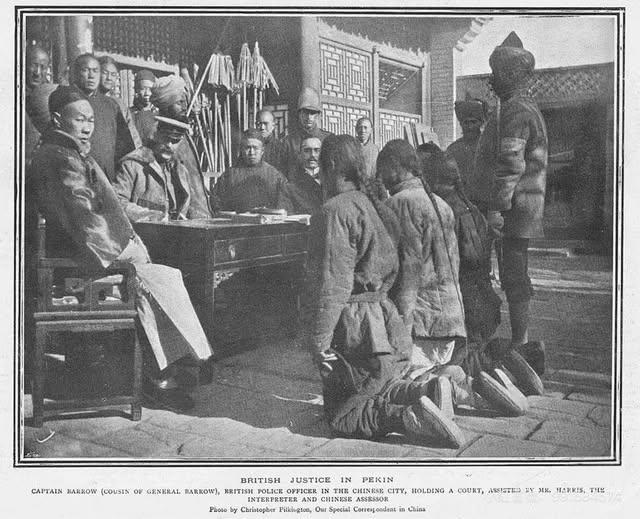 1901年,北京,英国军官巴罗上尉大摇大摆坐在中式庭院的桌后,旁边陪着翻译、所谓的中国陪审,身后站着英印军警和汉奸巡捕,而桌前,三个留着辫子、穿着破旧棉衣的中国人,正跪在地上受审——他们,就是当年反抗列强侵略的义和团成员。 照片的标题更讽刺到骨子里:“BRITISH JUSTICE IN PEKIN”,直译就是“北京的英国正义”。这张照片由英国驻华特派记者克里斯托弗·皮尔金顿拍摄,当年发表在英国主流报刊上,用来给英国的殖民侵略做宣传,大肆宣扬自己维护秩序、镇压暴徒的“文明功绩”,可在今天的我们看来,这根本不是什么正义,而是彻头彻尾的殖民霸权,是列强践踏中国主权的铁证!