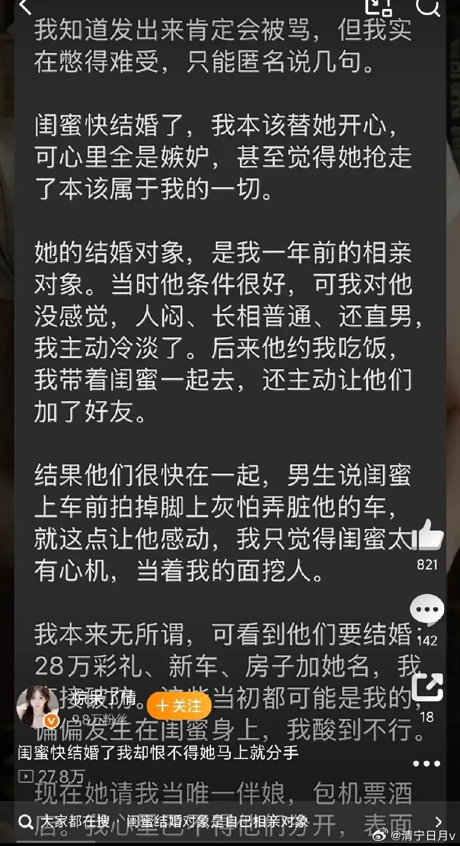 笑死了,小仙女发文说,自己没看上的相亲对象,居然娶了闺蜜当老婆而且闺蜜还是陪她去