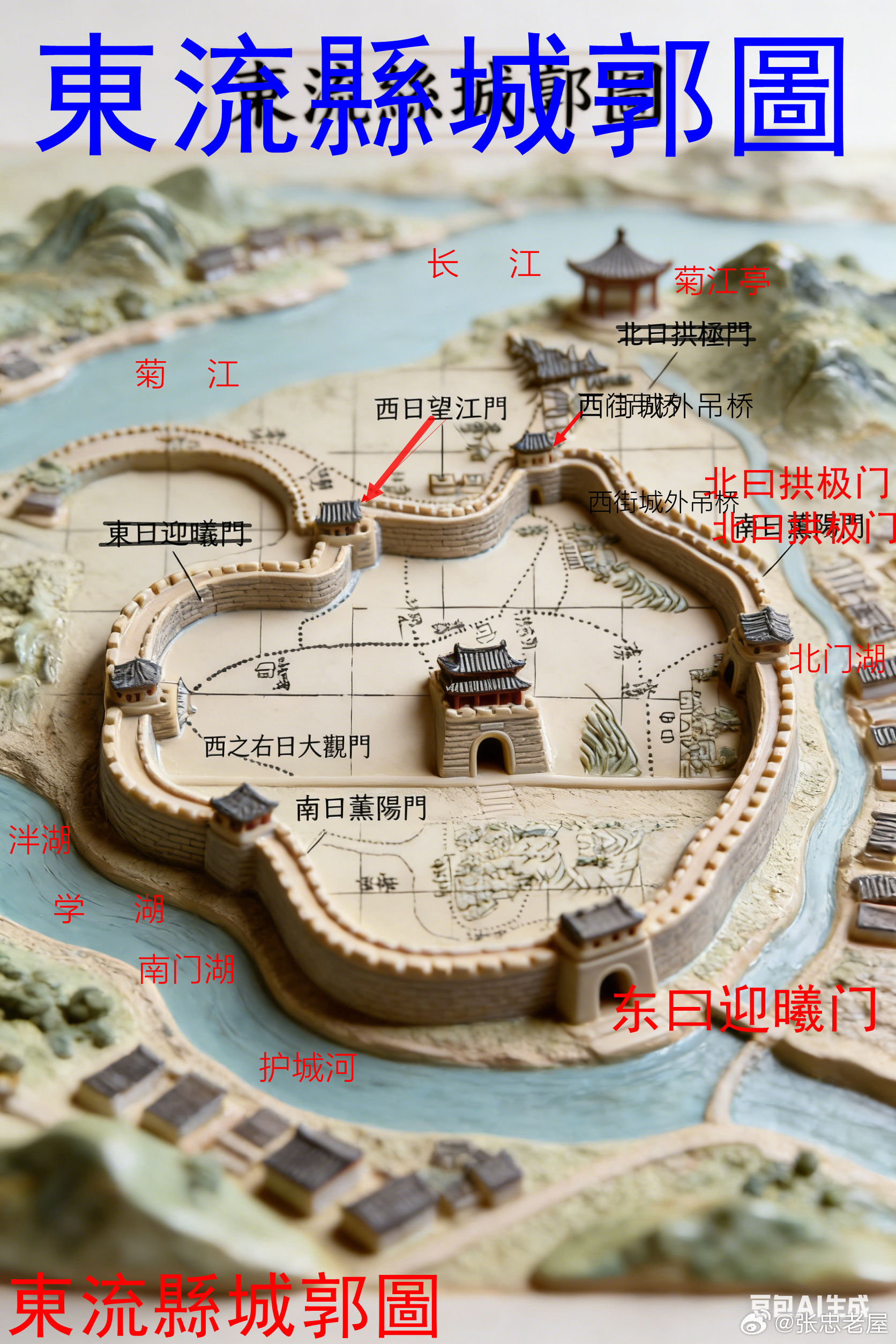 東流縣城郭圖老屋AI联合制作《东流县城郭图》;草图效果图AI制作;修订:老屋张忠;文字提供:老屋张忠AI制图;效果图方位修订:老屋张忠;文字提供:老屋张忠