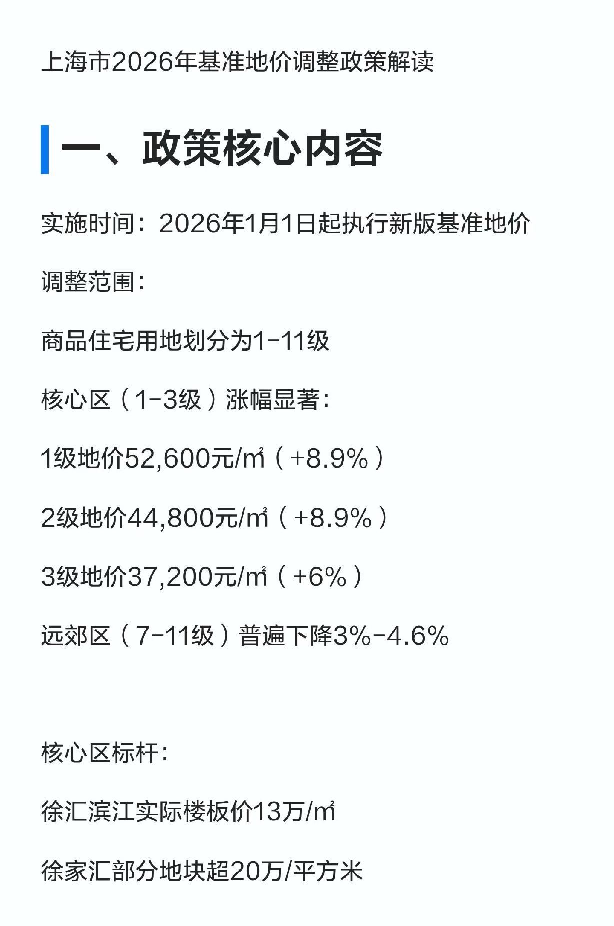 刚刚官宣:核心地价,全面上涨 2026年1月1日起,上海市基准地价调整,商品住宅用地划分为1-11级,核心区1-3级涨幅显著,分别上调8.9%、8.9%和6%,远郊区普遍下降3%-4.6%。徐汇滨江和徐家汇部分地块地价领先。