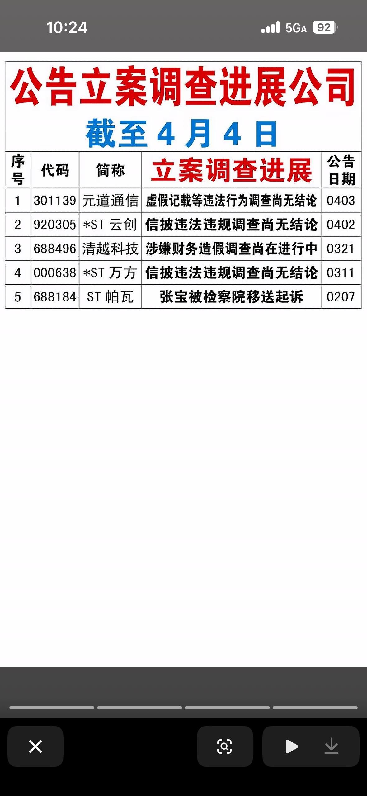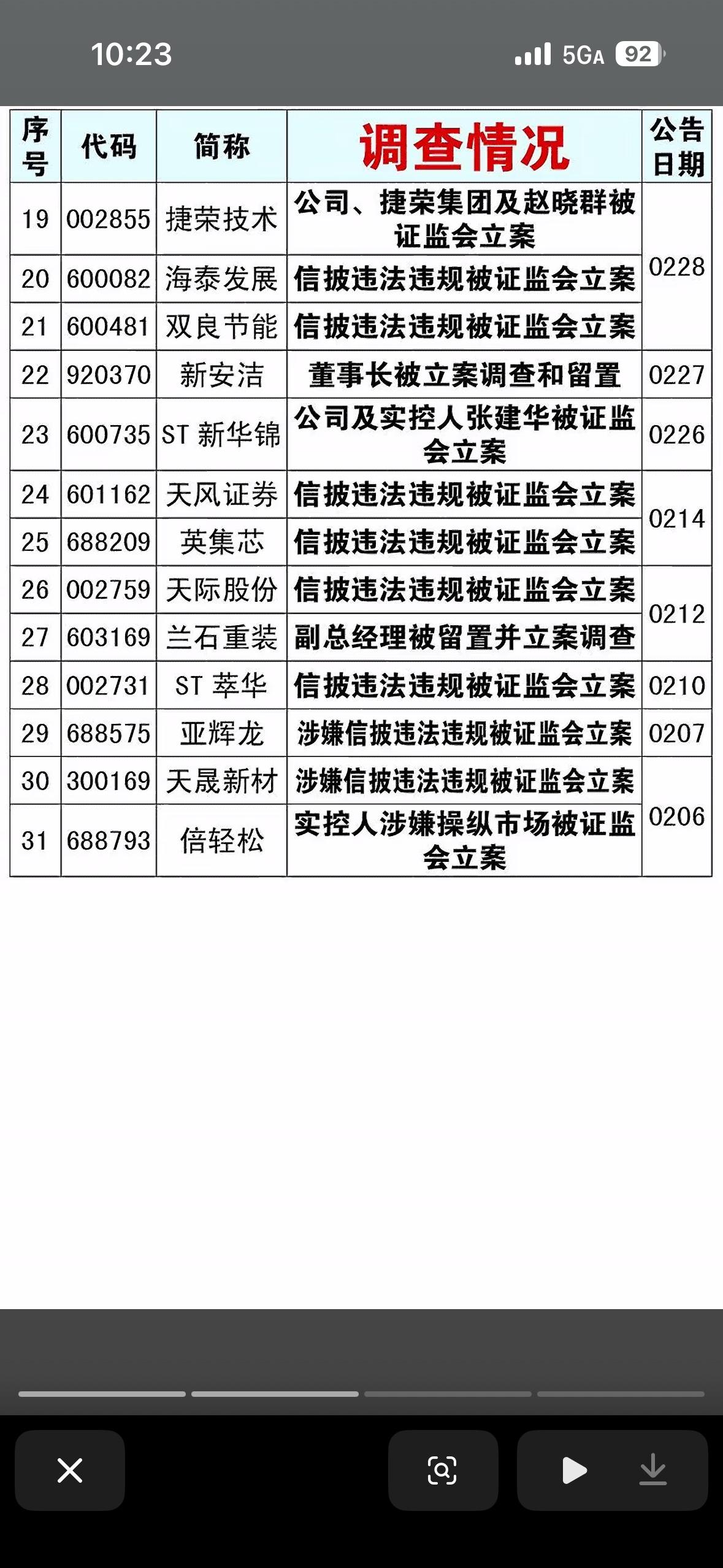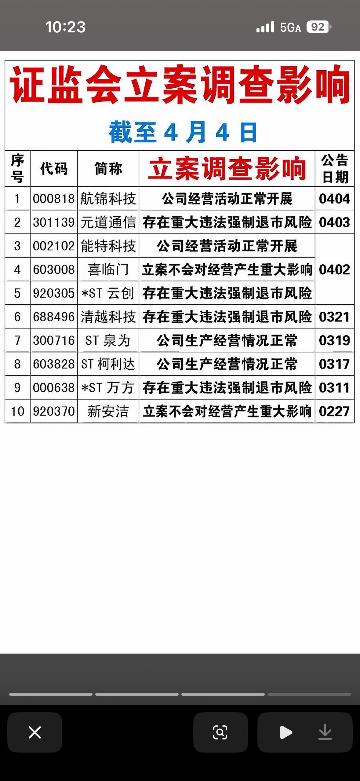 2月1日至4月3日期间,被证监会立案调查的18家公司名单。 与前两张关于股东买卖股票的图表不同,这张图反映的是监管层面的风险,通常被视为股市中的“黑天鹅”或“雷区”。 核心风险点分析 这张表中的公司主要面临以下几类严重的合规问题: 信息披露违规(重灾区) 这是列表中占比最大的原因,包括“涉嫌信披违法违规”、“信披违规”等。 - 代表公司: 航锦科技、电科数字、观典防务、能特科技、*ST奥维、湘邮科技等。 - 含义: 这意味着公司可能隐瞒了重要信息、发布了虚假财报,或者没有及时披露重大事项。这是证监会打击的重点,一旦被查实,公司可能面临巨额罚款、退市风险警示(ST),甚至强制退市。 关键人物涉案(高管/实控人) 很多立案调查直接针对公司的“掌舵人”。 - 代表公司: - 仙鹤股份: 王明龙涉嫌短线交易。 - 退市海越: 董事、总经理被调查。 - 田野股份、ST泉为、利尔达: 公司及董事长/实控人双双被立案。 - *ST鞍成: 董事长被公安机关立案侦查。 - 含义: “擒贼先擒王”,当公司的核心管理层出事,公司的经营决策会陷入混乱,且往往伴随着内部治理的巨大漏洞。特别是像ST鞍成和ST易连涉及到公安机关立案,说明问题可能已经触犯刑法(如挪用资金、职务侵占),性质比单纯的行政违规更严重。 资金占用与挪用 - 代表公司: *ST易连(涉嫌挪用资金)。 - 含义: 这是典型的掏空上市公司行为,大股东的钱拿走了,烂摊子留给上市公司和散户,是监管层严厉打击的恶性行为。 结合前两张图的深度解读 如果把这三张图放在一起看,我们可以拼凑出当前市场的全貌: 1. 冰火两重天: - 图1(增持): 少数优质公司(如中国海油)的大股东在真金白银地护盘,显示信心。 - 图2(减持): 大量股东(166家)在疯狂出逃,尤其是高管和创投机构,急于落袋为安。 - 图3(立案): 监管层正在密集“排雷”,大量绩差股、问题股被立案调查。 2. 投资避坑指南: - **远离“ST”和“*ST”:** 图中立案的公司很多都带ST标识(如ST奥维、ST柯利达、ST易连等),这些本身就是高风险股,现在更是雪上加霜。 - 警惕频繁违规的小盘股: 很多被立案的公司属于中小市值企业,治理结构不规范。 - 关注监管动向: 当前监管环境趋严(“国九条”背景),对于信披违规是“零容忍”。 总结建议: 这张图是一份“高危名单”。对于普通投资者来说,看到持仓股票出现在这个列表里,通常的第一反应应该是规避风险,因为立案调查的结果往往具有极大的不确定性,且股价在调查期间往往会持续下跌。