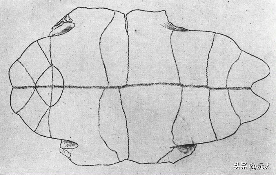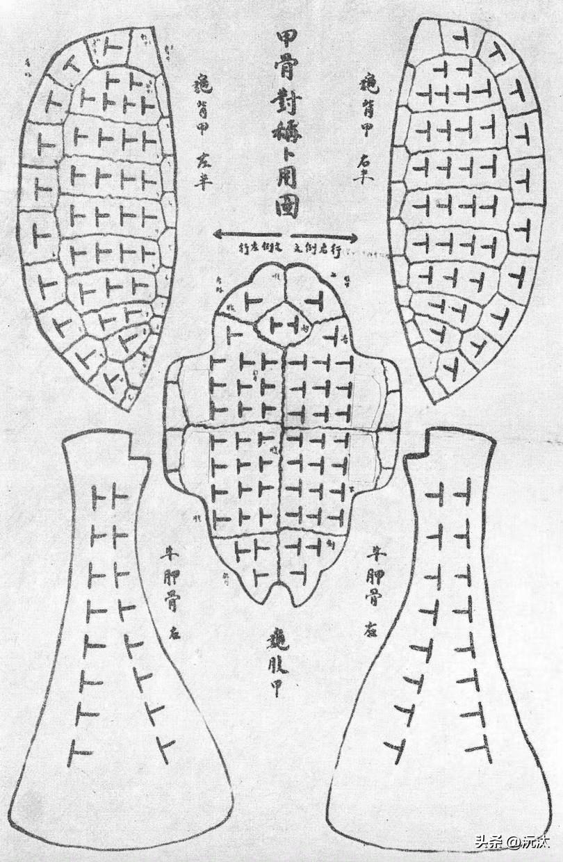 甲骨,龟甲和牛骨。沅汰博物馆 刻甲骨文的“骨”最多的是肩胛骨,一般是牛的肩胛骨,除了牛肩胛骨还有羊肩胛骨、猪肩胛骨、鹿肩胛骨、马肩胛骨。 牛肩胛骨有的用左肩胛骨,也有用右肩胛骨。根据董作宾说的方法来判断是左肩胛骨还是右肩胛骨:左肩胛骨上边的臼部的右边有突出的像半球形的骨端;右肩胛骨上边的臼部的左边有突出的像半球形的骨端,如图4。 一个全龟包括背甲和腹甲,如图1。占卜刻辞多用腹甲,如图2;但绝不是只用腹甲,也有用背甲的,如图3。 龟背甲的用法是先切成两半,从颈到脊到尻平分,左右两半的卜兆刻辞以对称为标准,如图4。