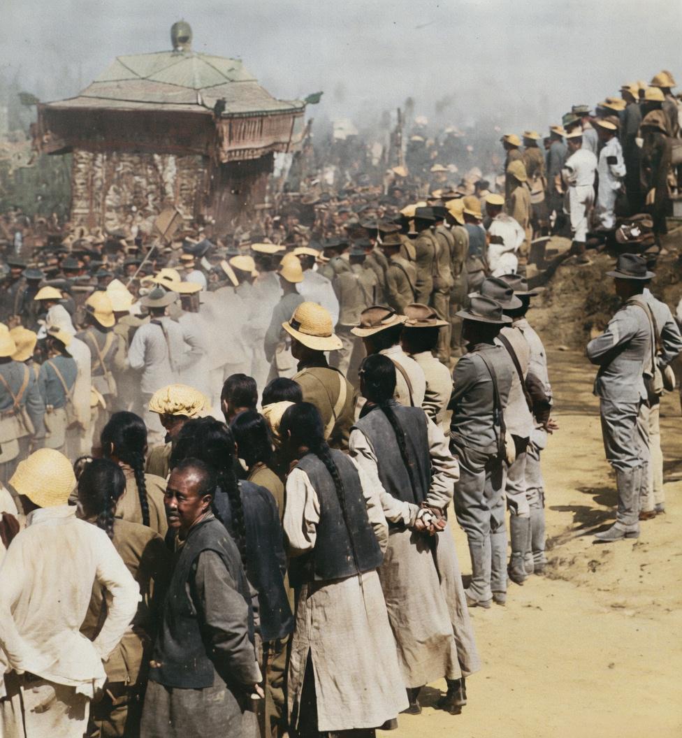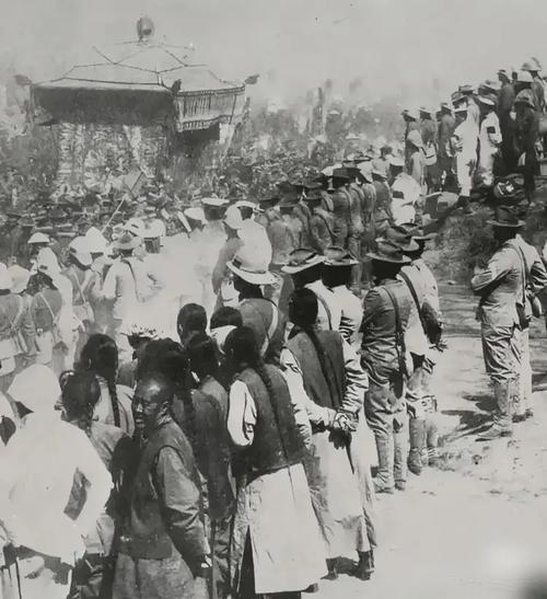 1909年3月,光绪皇帝的梓宫(灵柩)从北京运往清西陵的送葬大典现场,这是一场大清国最高规格的皇家葬礼。 照片中最醒目的,是队伍前方那顶巨型中式灵轿——梓宫大舆,里面安放着光绪帝的金丝楠木棺材。这是清代帝后葬礼的最高规格,需要上百名杠夫抬行,轿身装饰极尽奢华,是皇权的终极象征。 这张照片拍摄于北京到河北易县清西陵的官道上,全程120多公里,送葬队伍走了整整4天3夜,沿途百姓被强制要求跪拜迎送,场面浩大,却处处透着压抑。