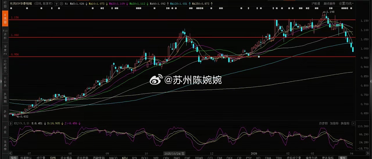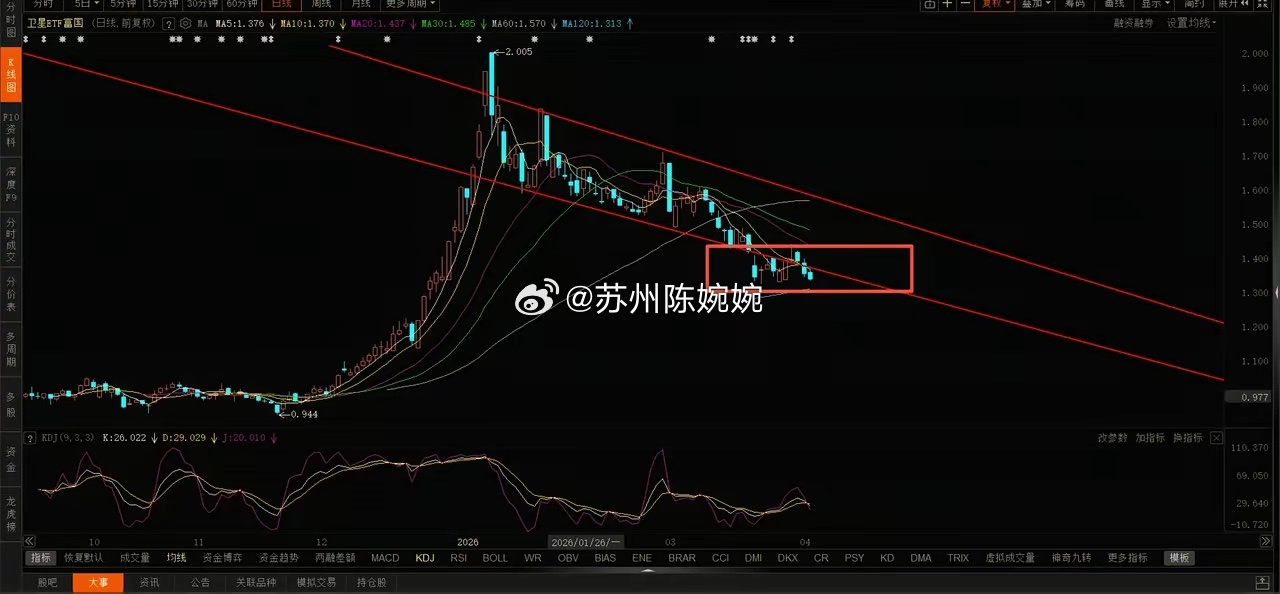 电池、光伏、航天走势分析1、电池。连续调整第4天,KDJ还没拐头向上,下周二开盘再向下冲下,基本调整差不多了,也到了箱体下边界,这个地方先看反弹。由于120日均线已经拐头向下了,所以这个月要走出箱体震荡当难度有点大了。不过月线上很明确,这个月即将回踩到10月均线,10月均线是有强支撑的。下个月即使走不出大行情,也有一个强力反弹行情可以做。2、光伏。和大盘走势一样,但是走弱时间稍微晚一点,也是跌破了上方横盘区间,要开始1:1向下调整,距离下方平台位置不远,大盘在这里反弹,光伏我认为周二再跌下,才基本到位了。但是上方横盘区间已经形成情况下,短期内只有反弹行情,没有持续上涨行情。3、卫星ETF。卫星和大盘走势基本同步,连续两天跌破了5、10天均线,下方没有均线可以收了,下一个支撑在前低附近。向下概率比较大一点。股市分析股市第一线