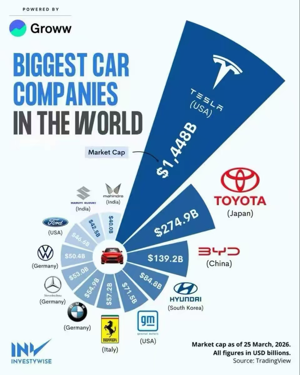 1. 图为至2026年3月25日的全球车企市值排名前十二。特斯拉14480亿美元等于余下车企总和,丰田第二2749亿美元,比亚迪1392亿美元第三,不到特斯拉十分之一。现代848亿第四,通用715亿第五,法拉利572亿第六。德国三家排7-9位,宝马598亿第7,奔驰530亿第8,大众504亿第9。福特466亿第10。印度的马鲁蒂铃木425亿第11,马恒达400亿第12。
