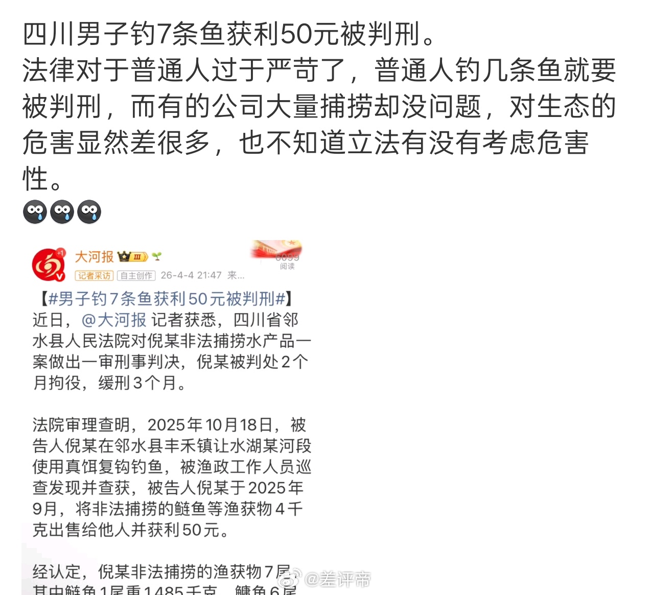 男子钓7条鱼获利50元被判刑我有理由怀疑这个标题就是故意引战的一下子戳到很多人了